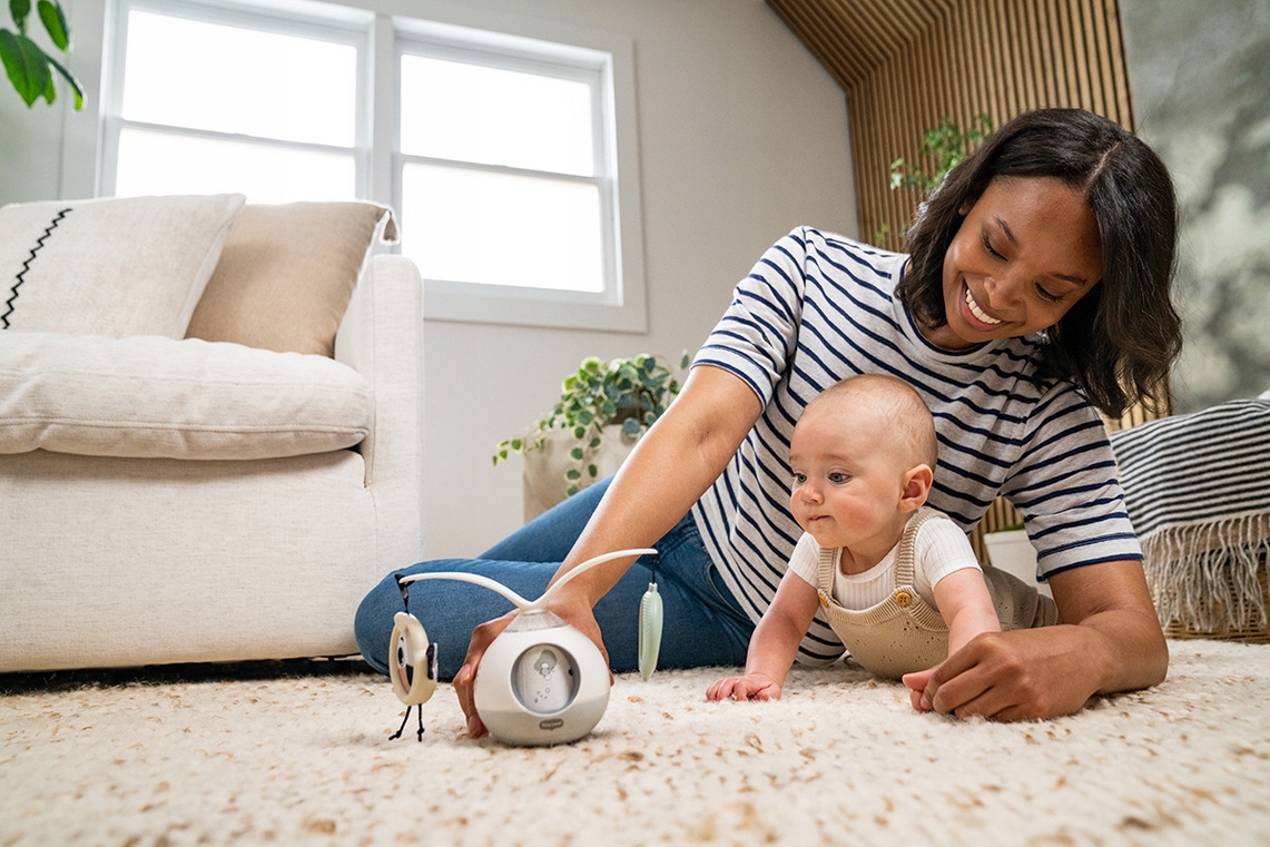Umieść karuzelkę w odpowiedniej odległości od dziecka (około 25 cm) i pozwól mu cieszyć się angażującym dźwiękiem i ruchem w pozycji na brzuszku, pomagając mu stopniowo pozostawać w tej pozycji nieco dłużej. Kiedy wychodzisz z domu, zabierz ze sobą karuzelkę, aby dziecko mogło cieszyć się komfortem znanej mu zabawki.