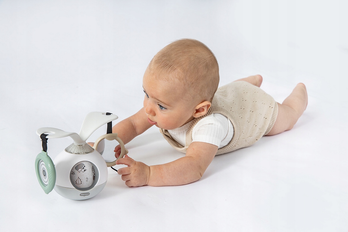 Gdy dzieci czują się coraz bardziej komfortowo w pozycji na brzuszku, będą w stanie opierać się na jednej z rąk, by móc dotykać i przesuwać zabawkę drugą ręką. Upewnij się aby umieścić karuzelkę w zasięgu dziecka.
