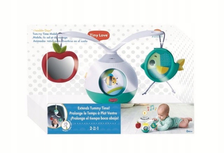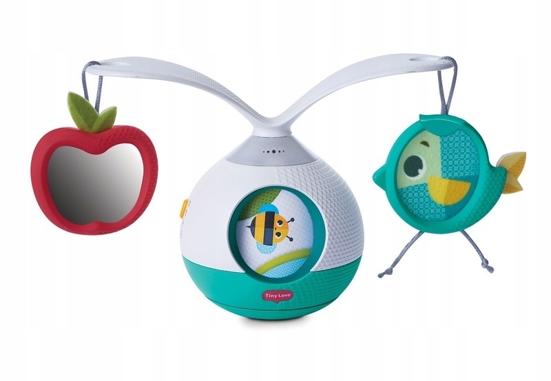 Zabawka posiada balansujący ruch i obracające się o 360° ramiona, na których wiszą przyjazne postacie zwierzątek, z lusterkiem i grafiką spirali, aby nieustannie inspirować dziecko do podnoszenia główki.