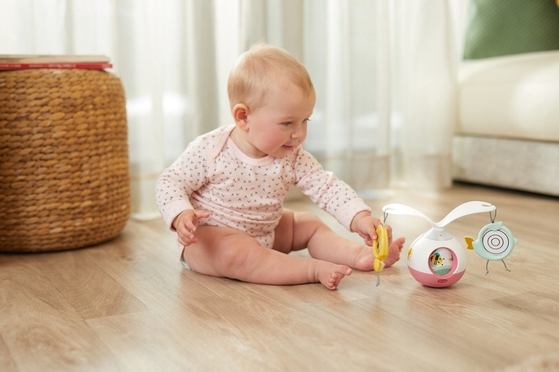 Gdy dzieci czują się coraz bardziej komfortowo w pozycji na brzuszku, będą w stanie opierać się na jednej z rąk, by móc dotykać i przesuwać zabawkę drugą ręką. Upewnij się aby umieścić karuzelkę w zasięgu dziecka.