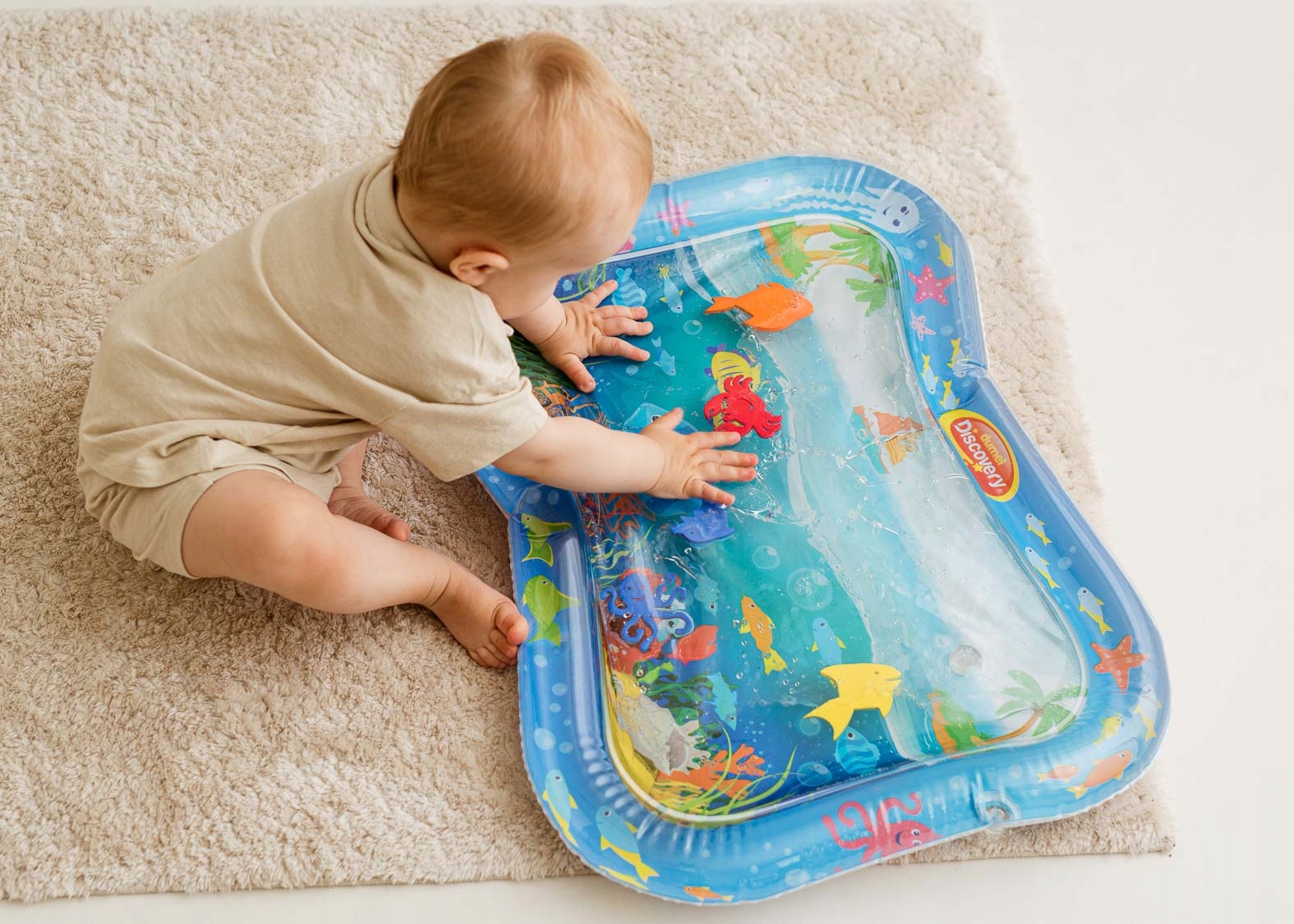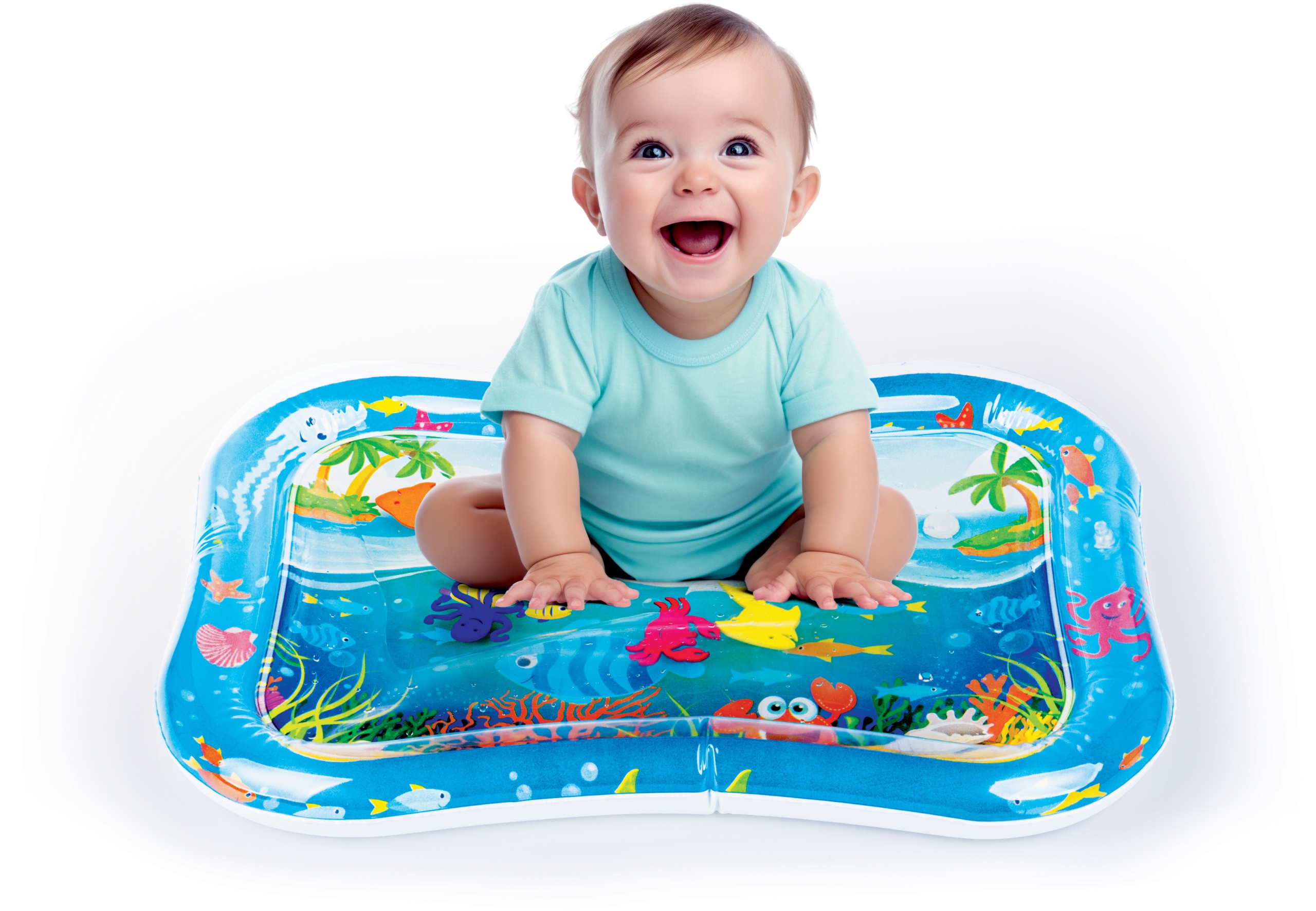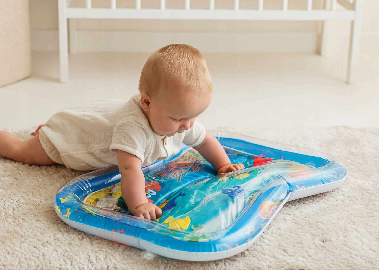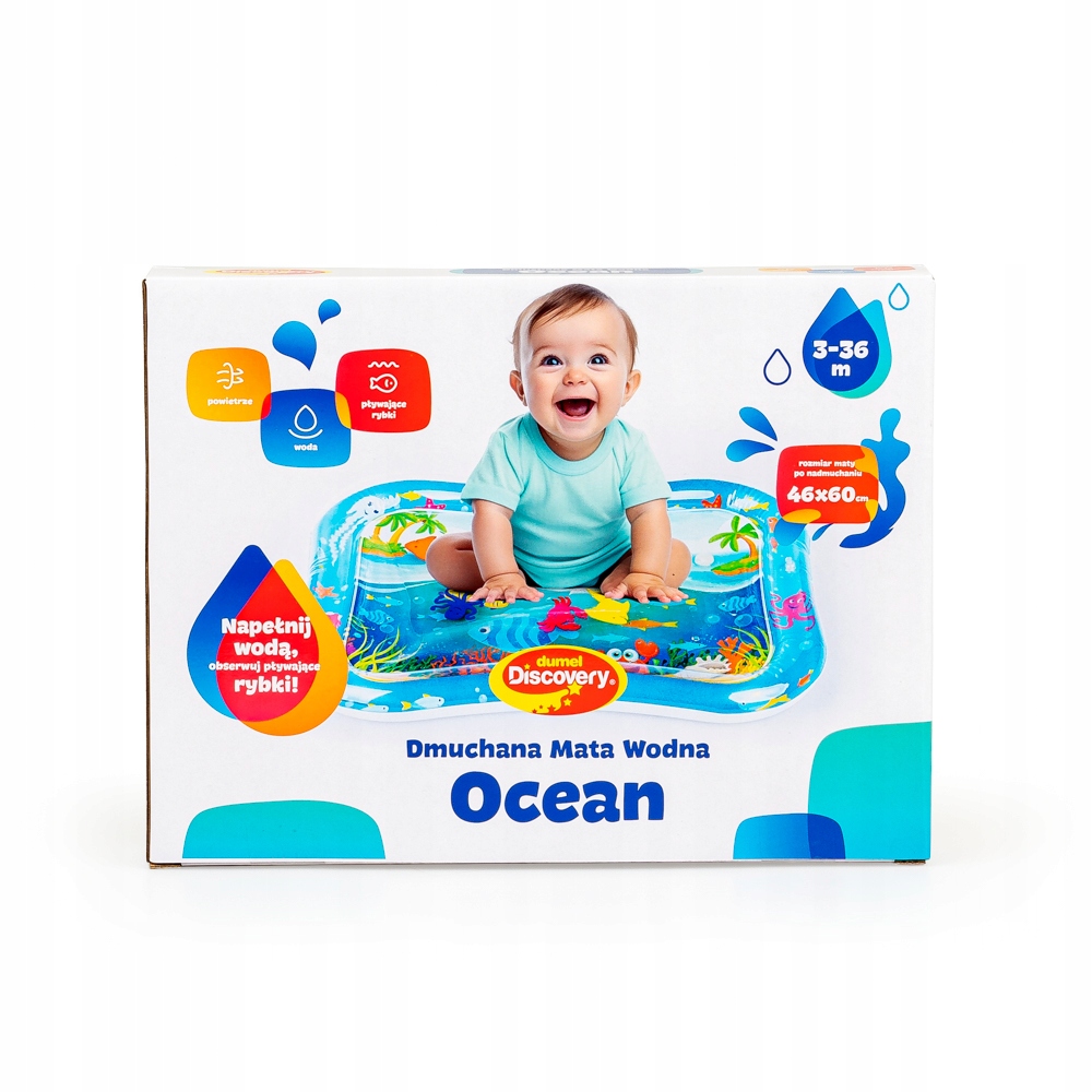 Mata wodna zapewni maluchowi niezapomniane wrażenia z odczuwania ruchu wody oraz obserwowania pływających w niej kolorowych kształtów, nawiązujących do wodnych stworzeń. Matę zdobią przyjazne obrazki, które umilą najmłodszym zabawę. Krawędź wyposażona jest w ukryty zawór, służący do nadmuchania brzegu maty, natomiast na spodzie znajduje się zawór do napełnienia środkowej części maty wodą. Gdy maluch położy się na środku maty lub przyciśnie go rączką, woda zafaluje, wprawiając w ruch kolorowe rybki. Aby mata mogła służyć jak najdłużej, należy napełniać ją wyłącznie wodą destylowaną i pamiętać o tym, aby po zakończonej zabawie wylać wodę, pozostawiając matę do wyschnięcia.