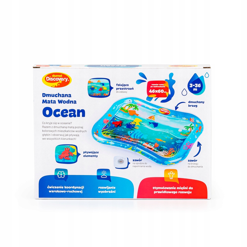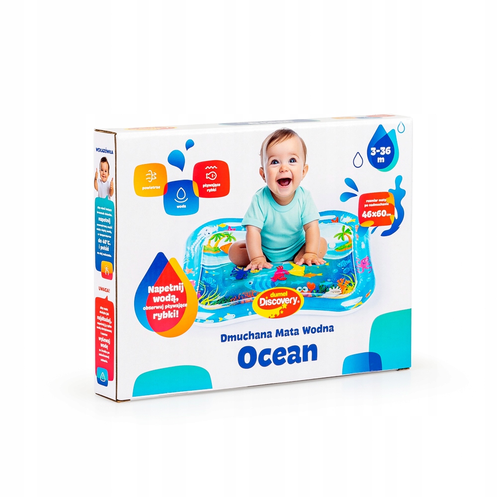 Mata wodna zapewni maluchowi niezapomniane wrażenia z odczuwania ruchu wody oraz obserwowania pływających w niej kolorowych kształtów, nawiązujących do wodnych stworzeń. Matę zdobią przyjazne obrazki, które umilą najmłodszym zabawę. Krawędź wyposażona jest w ukryty zawór, służący do nadmuchania brzegu maty, natomiast na spodzie znajduje się zawór do napełnienia środkowej części maty wodą. Gdy maluch położy się na środku maty lub przyciśnie go rączką, woda zafaluje, wprawiając w ruch kolorowe rybki. Aby mata mogła służyć jak najdłużej, należy napełniać ją wyłącznie wodą destylowaną i pamiętać o tym, aby po zakończonej zabawie wylać wodę, pozostawiając matę do wyschnięcia.