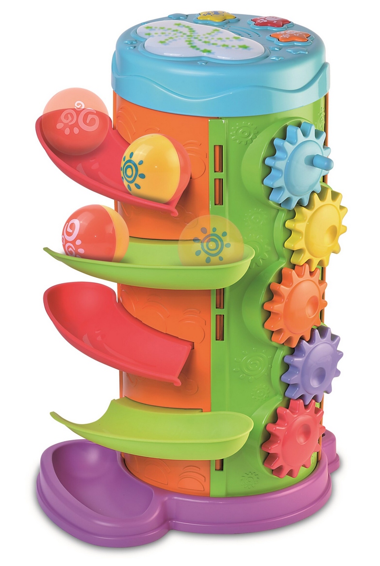 Na każdej ze stron znajduje się tu inna zabawa, która pozwoli dziecku ćwiczyć motorykę małą, poznawać zależności przyczynowo – skutkowe i rozwijać zdolności poznawcze. Wśród kolorowych ścianek zabawki pochowało się 5 różnych zabaw: zjeżdżalnia z piłeczkami, trybiki do kręcenia, sorter kształtów z klockami do dopasowania, ruchome elementy do przesuwania i obracania, a także, na samej górze, urocza chmurka z przyciskami aktywującymi melodie i kolorowe, świetlne wzorki.