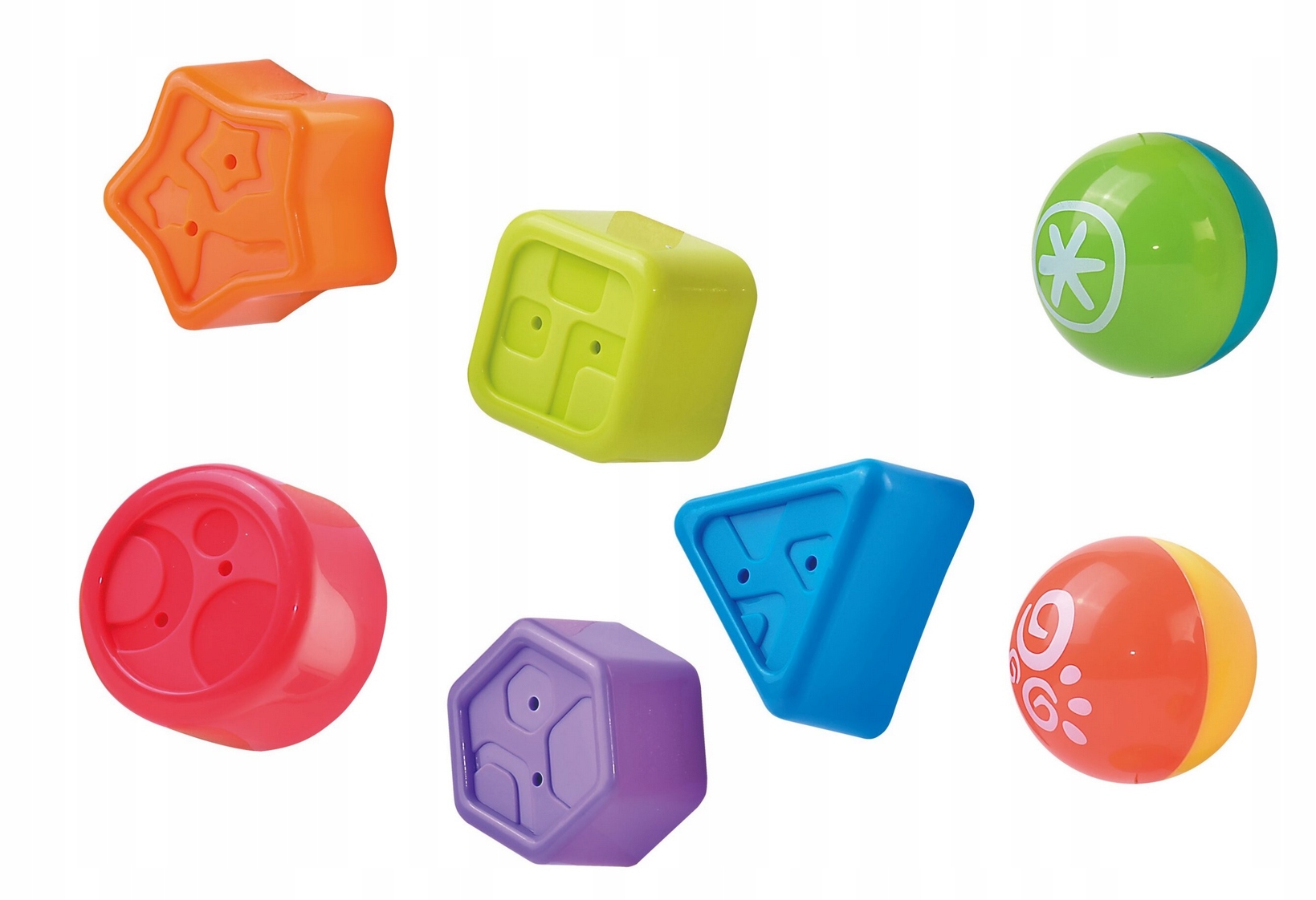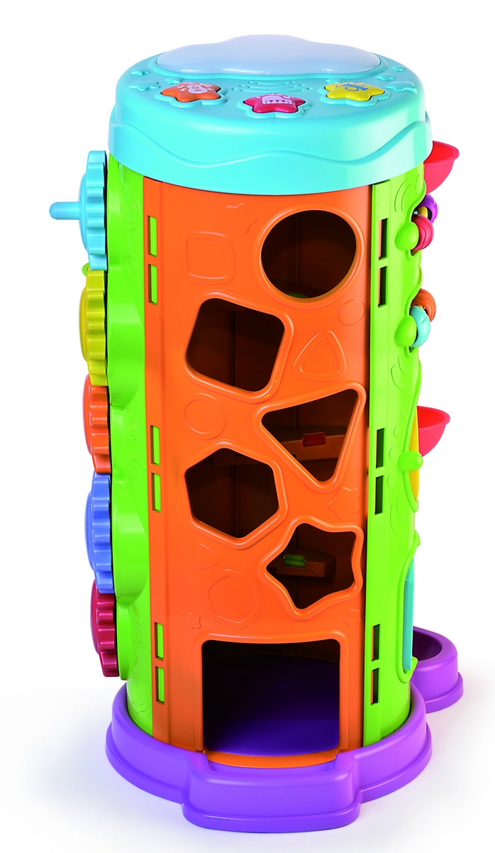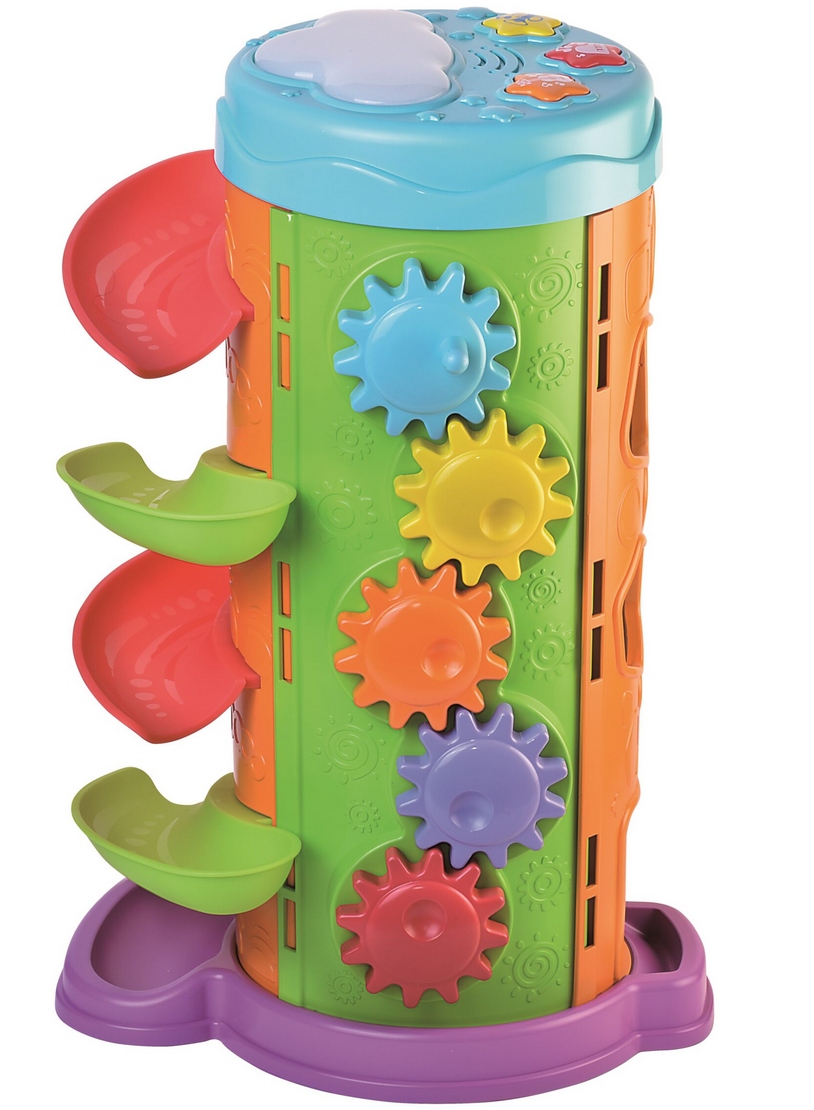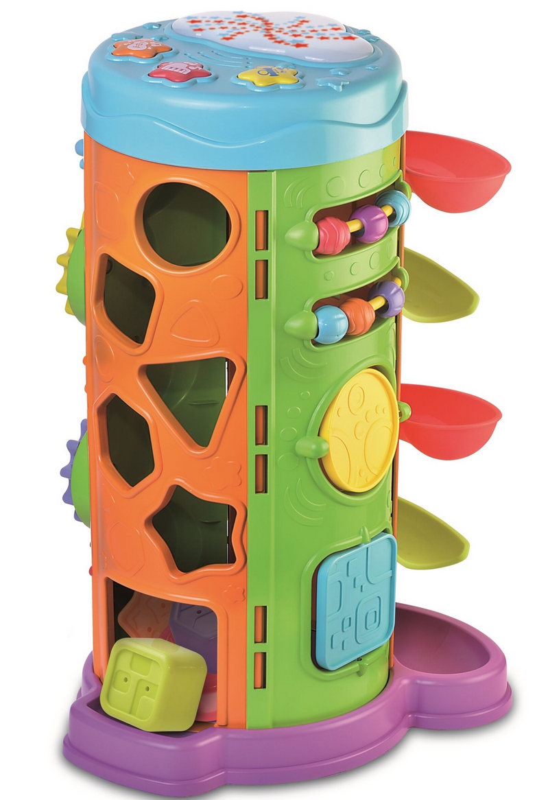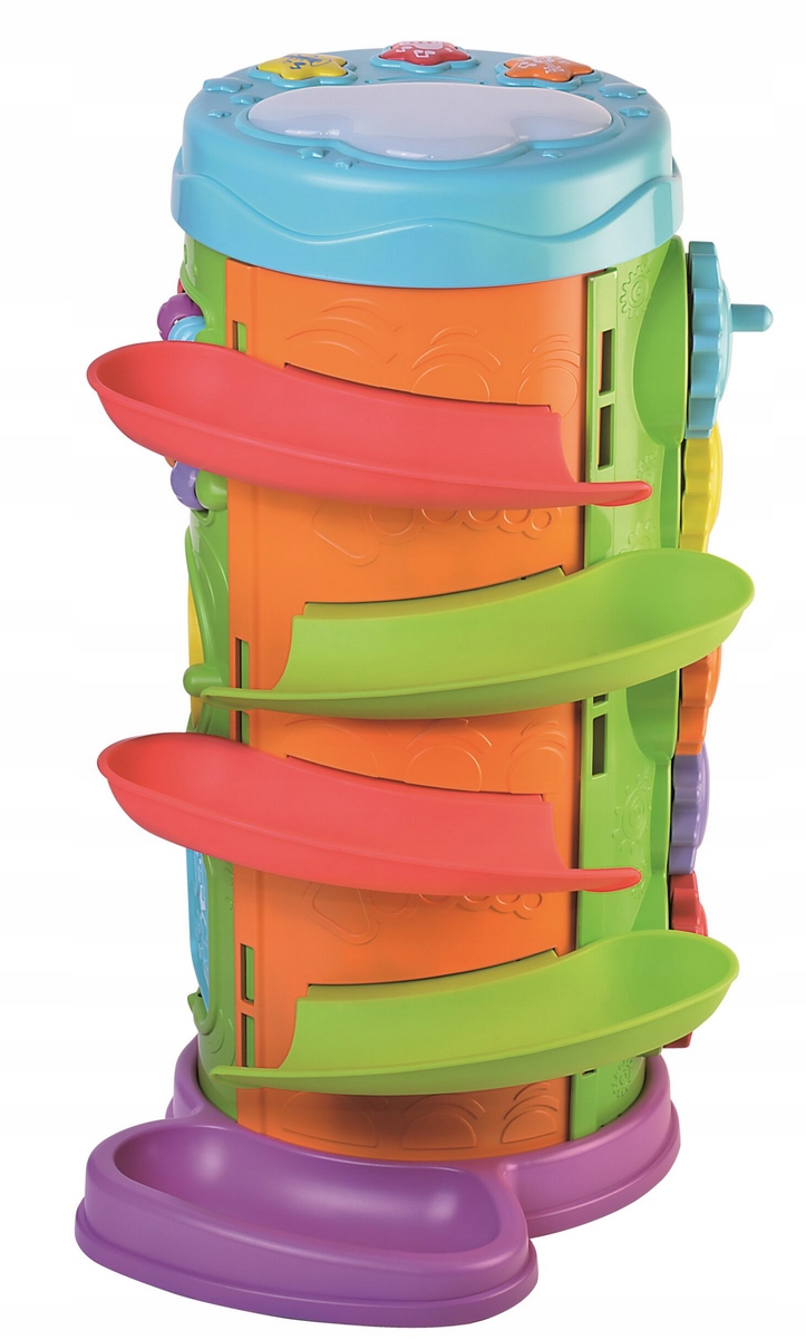 Na każdej ze stron znajduje się tu inna zabawa, która pozwoli dziecku ćwiczyć motorykę małą, poznawać zależności przyczynowo – skutkowe i rozwijać zdolności poznawcze. Wśród kolorowych ścianek zabawki pochowało się 5 różnych zabaw: zjeżdżalnia z piłeczkami, trybiki do kręcenia, sorter kształtów z klockami do dopasowania, ruchome elementy do przesuwania i obracania, a także, na samej górze, urocza chmurka z przyciskami aktywującymi melodie i kolorowe, świetlne wzorki.