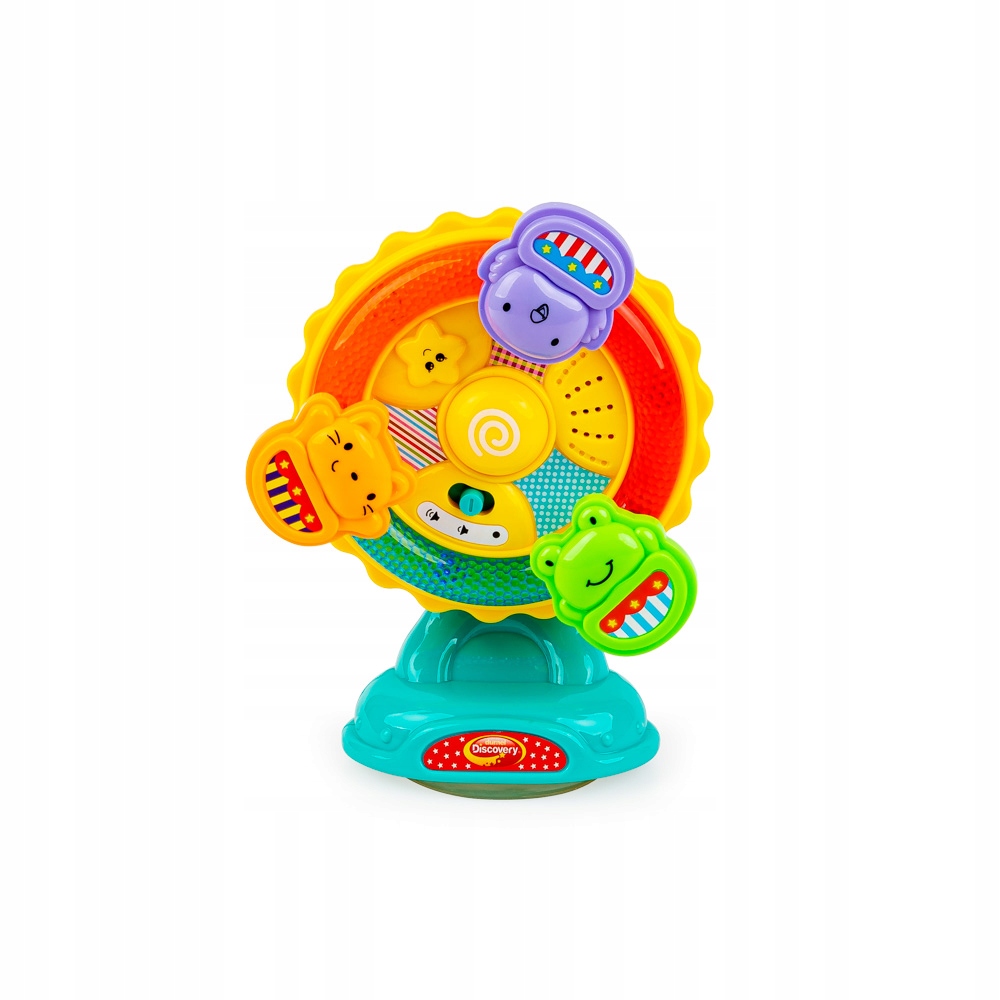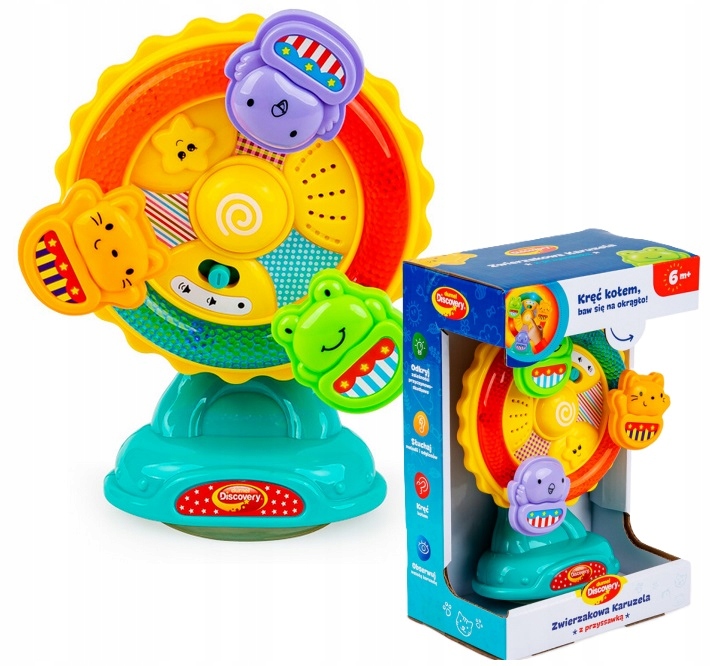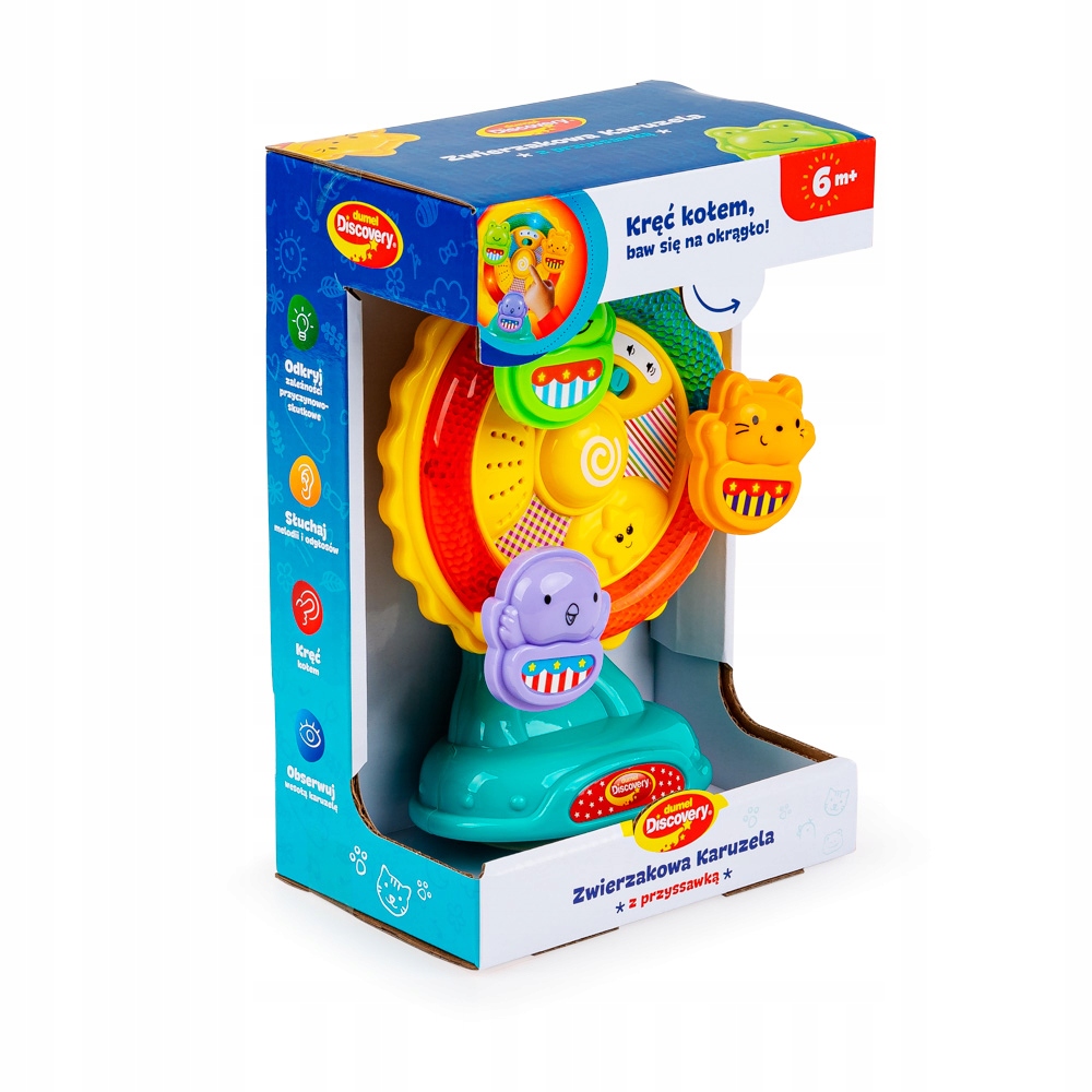 Karuzelka kryje w sobie odgłosy zwierząt, melodie i migające światełka, a dzięki praktycznej przyssawce, można ją przymocować do płaskiej, czystej i gładkiej powierzchni, aby nie przesuwała się w trakcie zabawy. Po naciśnięciu na każde ze zwierzątek, maluch usłyszy jego odgłos oraz melodię. Funkcja regulacji głośności umożliwia dostosowanie zabawki do indywidualnych potrzeb.