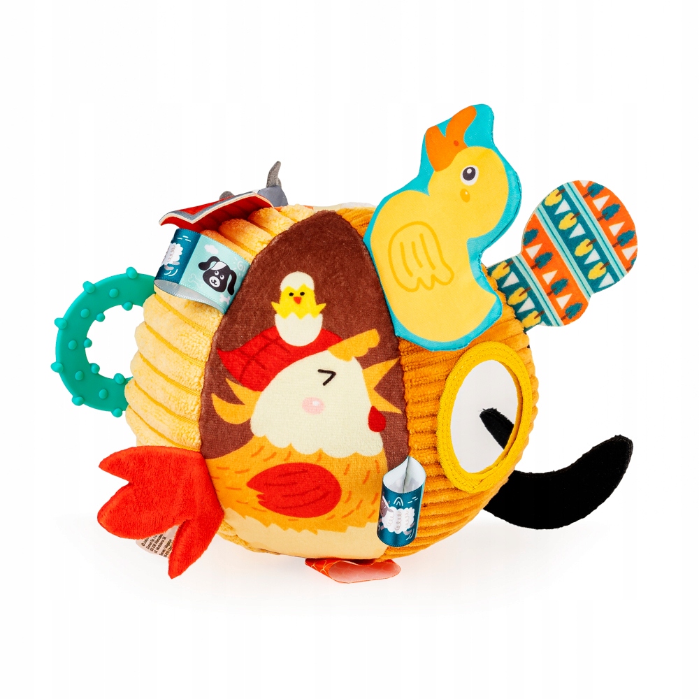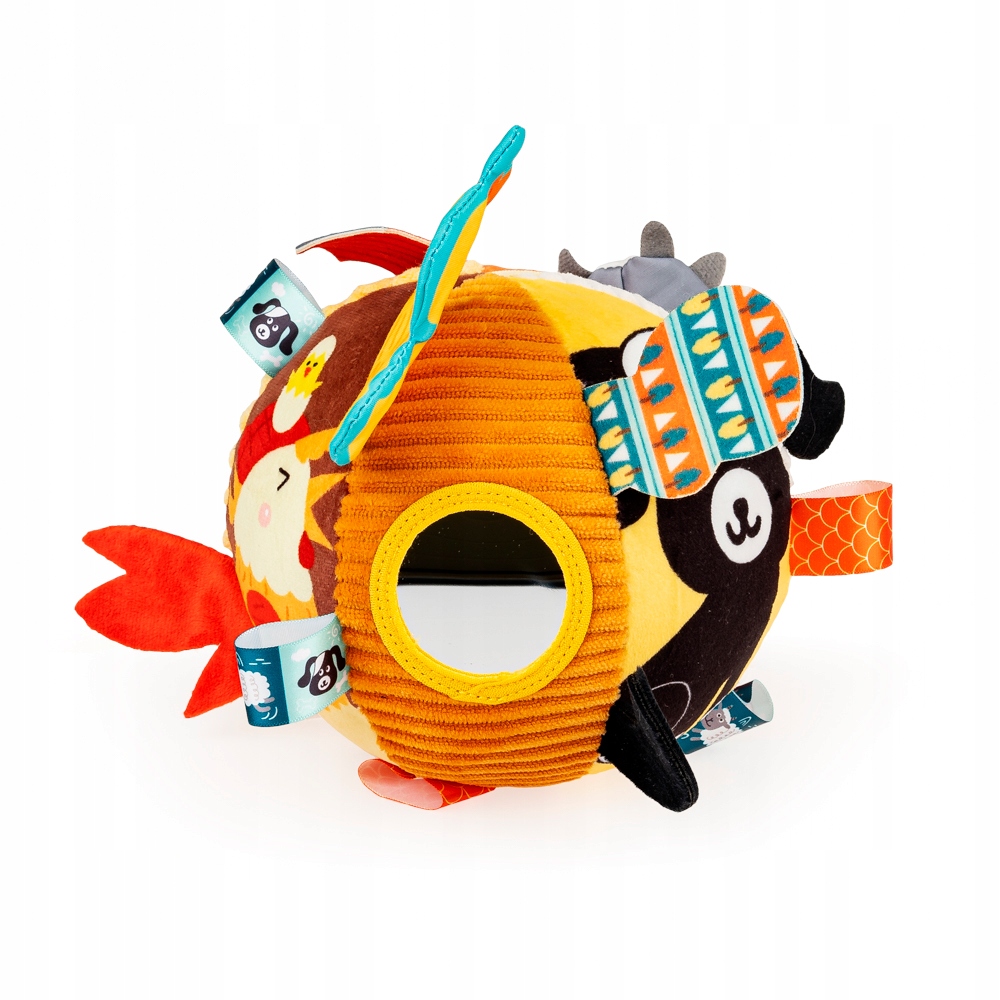 Piłkę zdobią podobizny zwierzaków oraz bezpieczne lusterko do samopoznania bobasa. Dodatkowo, znajdziemy tu także wiele odstających elementów, stworzonych z myślą o aktywizowaniu dzieci i rozwijaniu ich zdolności poznawczych, a wśród nich piszczącą głowę owieczki, szeleszczącą kaczuszkę czy ruchome pierścienie do przesuwania. Wewnątrz piłeczki ukryty jest dzwoneczek, dzięki czemu przy potrząsaniu zabawa wydaje wesoły dźwięk.