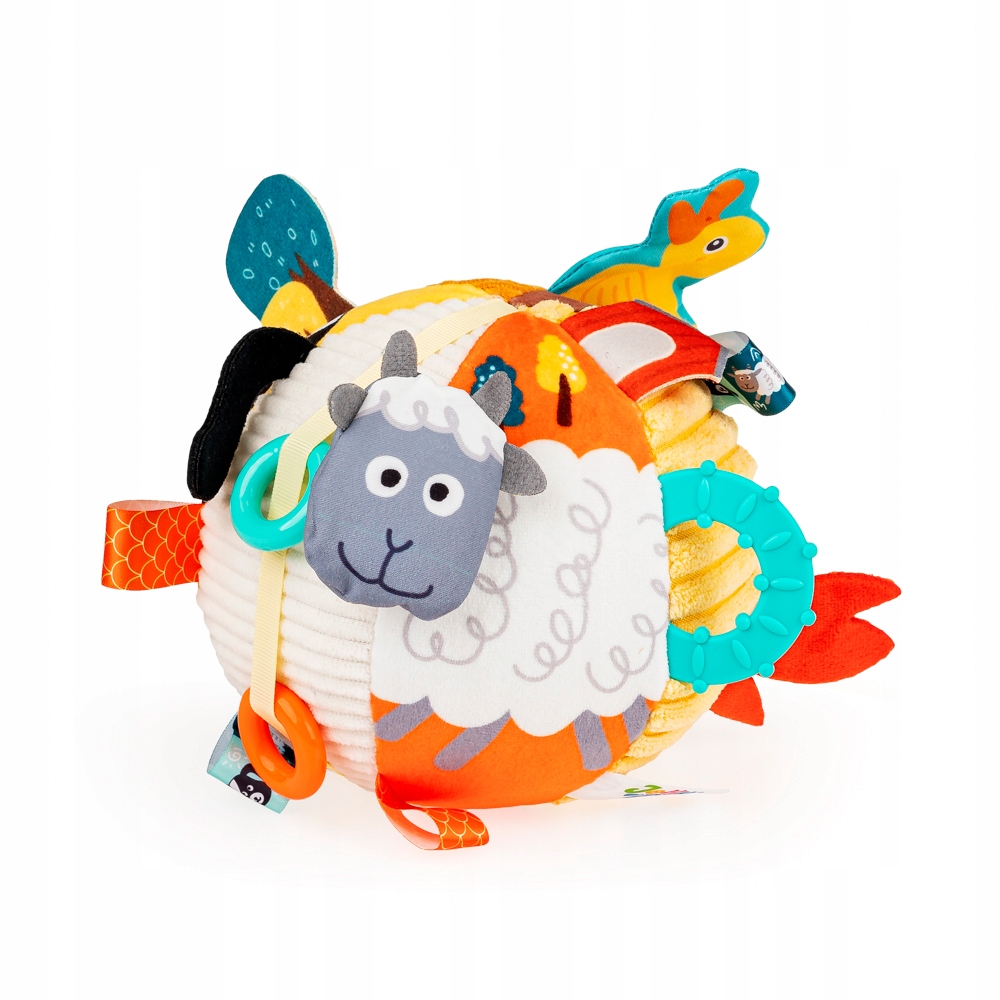 Piłkę zdobią podobizny zwierzaków oraz bezpieczne lusterko do samopoznania bobasa. Dodatkowo, znajdziemy tu także wiele odstających elementów, stworzonych z myślą o aktywizowaniu dzieci i rozwijaniu ich zdolności poznawczych, a wśród nich piszczącą głowę owieczki, szeleszczącą kaczuszkę czy ruchome pierścienie do przesuwania. Wewnątrz piłeczki ukryty jest dzwoneczek, dzięki czemu przy potrząsaniu zabawa wydaje wesoły dźwięk.