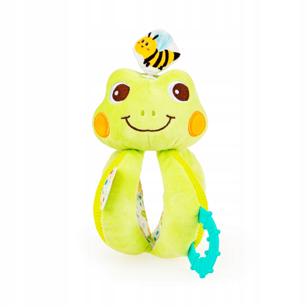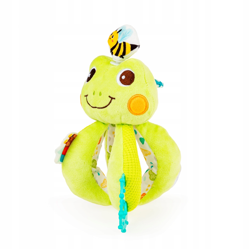 W żabiej główce ukryty jest dzwoneczek, dzięki czemu, przy każdym potrząśnięciu, wyda ona miły odgłos. Kształt zabawki ułatwi małym rączkom jej chwytanie. Na głowie pluszaka znajduje się mała pszczółka, a gdy bobas pociągnie za kółeczko z podobizną motylka, pszczółka radośnie zawiruje. Zabawkę zdobi miękki gryzaczek, który przyniesie ulgę obolałym dziąsłom ząbkującego malucha.