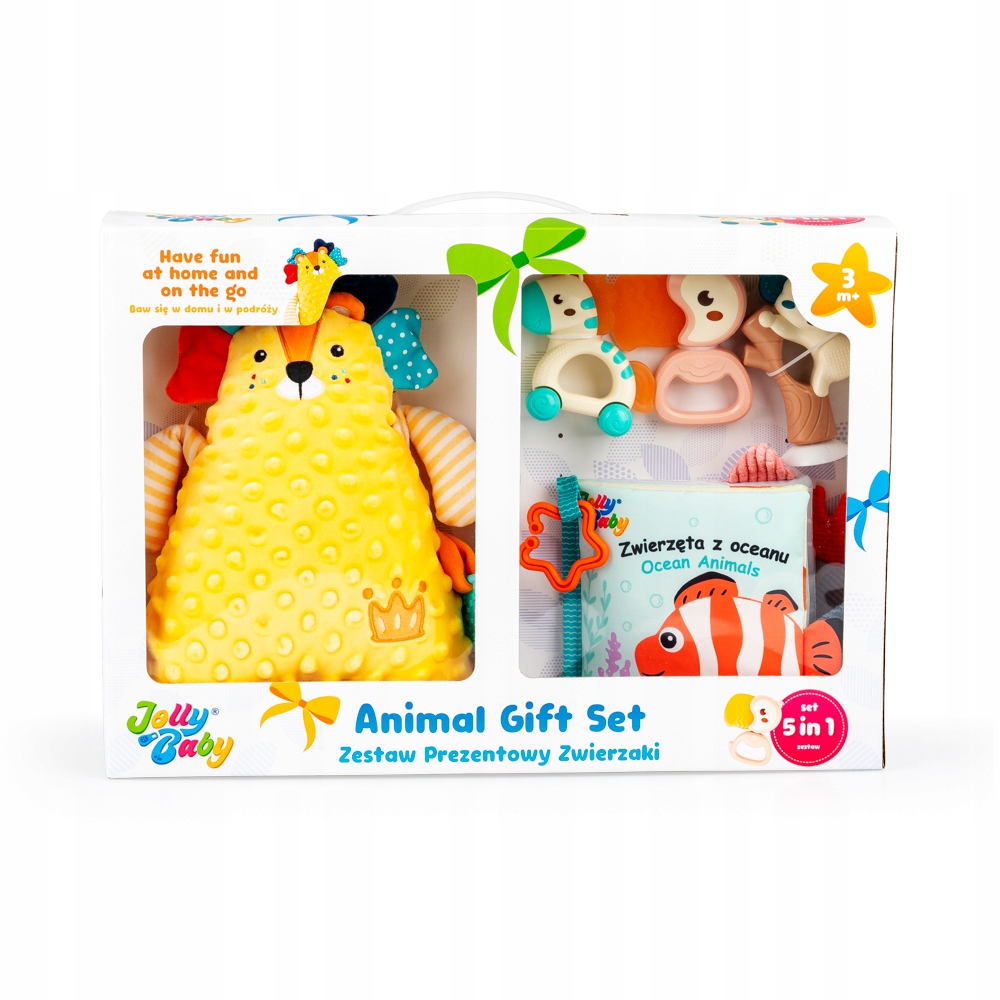 W skład zestawu wchodzi pięć zabawek, a każda z nich kryje w sobie inne niespodzianki. Znajdziemy tu przytulankę Lew, wykonaną z materiałów o zróżnicowanych fakturach i ozdobioną gryzakiem, materiałową książeczkę Zwierzęta z oceanu, zawierającą nazwy wodnych zwierzątek w języku polskim i angielskim, gryzaczek Tukan, który terkocze przy obracaniu jego głowy, Zebrę na kółkach, a także grzechoczącego Koalę na przyssawce. Zapakowany w estetyczne opakowanie prezentowe zestaw będzie idealnym upominkiem dla każdego malucha. Z poszczególnych zabawek można korzystać równocześnie lub zabrać jedną czy dwie z nich w podróż, aby ulubione zwierzaki dotrzymywały bobasowi towarzystwa podczas wycieczki.