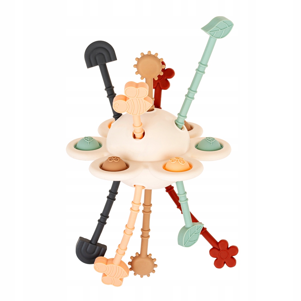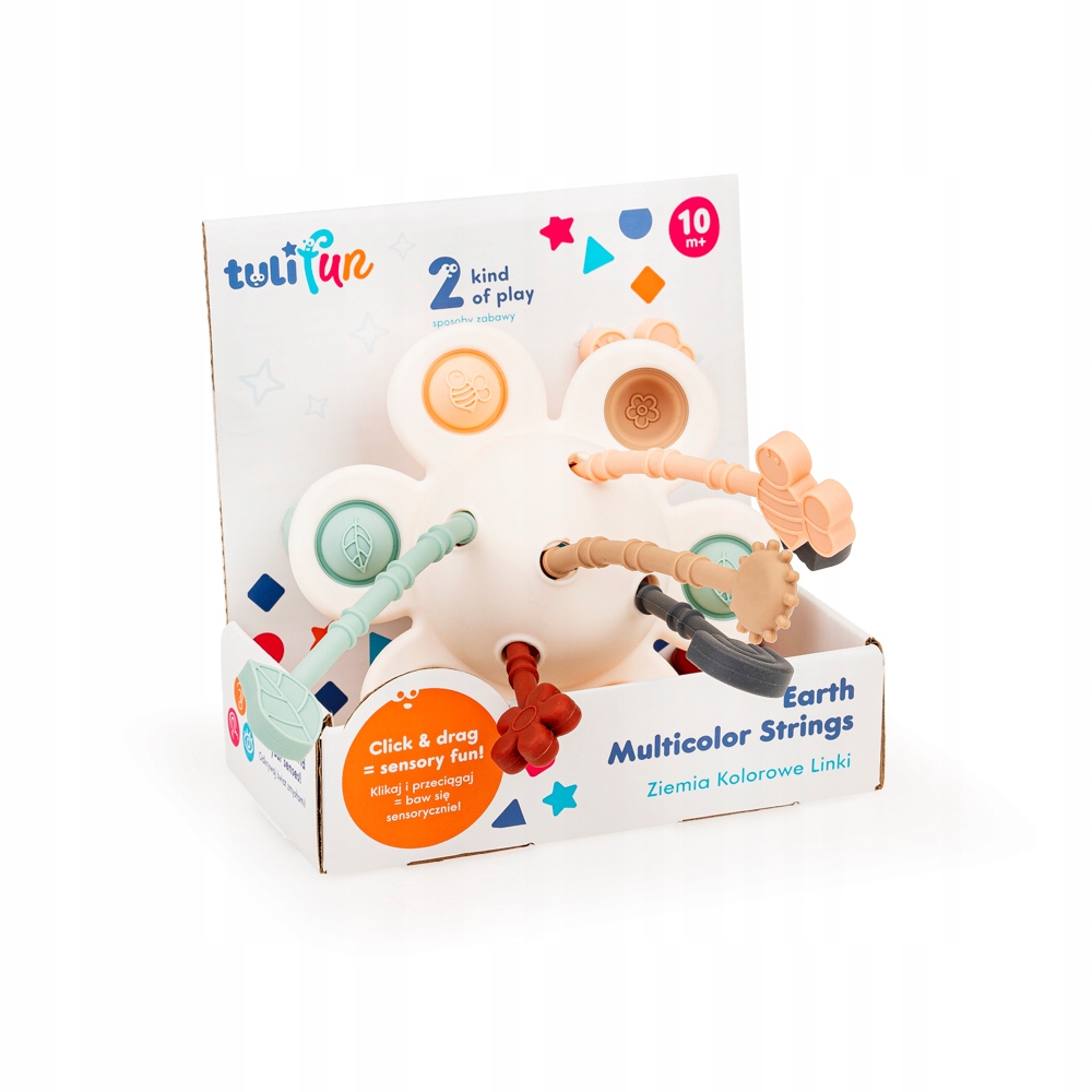 Ta stylowa zabawka w pięknych kolorach ziemi zapewni moc sensorycznej zabawy. Znajdziemy tu kilka kuleczek do wciskania i wyciskania z powrotem na górę oraz pięć kolorowych linek do przeciągania. Każdą z nich zdobią wypustki i urocze kształty.