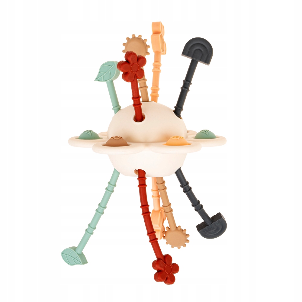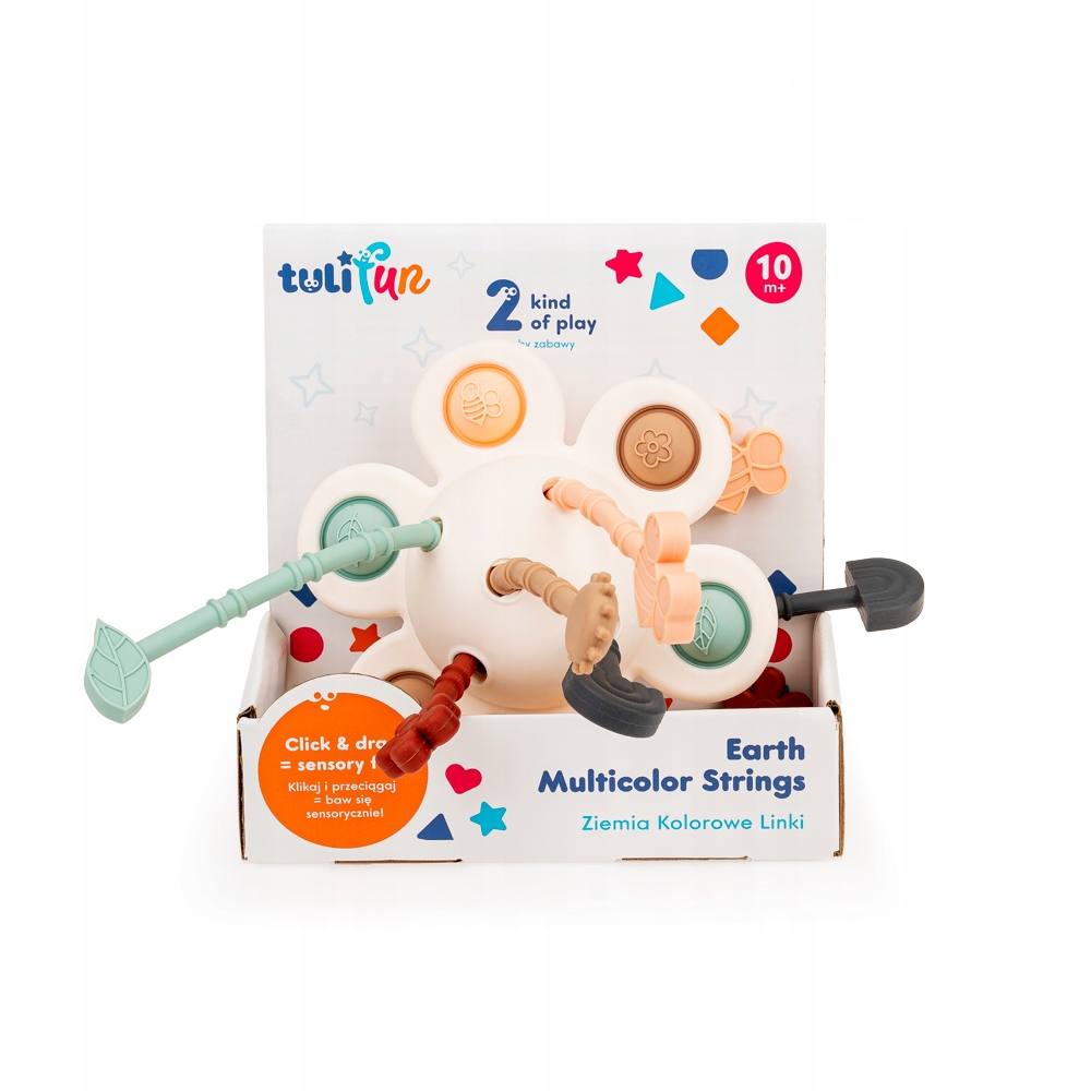 Ta stylowa zabawka w pięknych kolorach ziemi zapewni moc sensorycznej zabawy. Znajdziemy tu kilka kuleczek do wciskania i wyciskania z powrotem na górę oraz pięć kolorowych linek do przeciągania. Każdą z nich zdobią wypustki i urocze kształty.