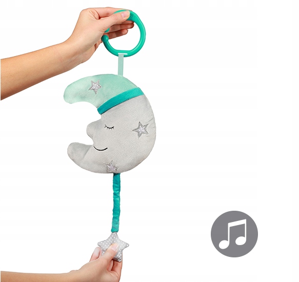 Miękki, sympatycznie uśmiechnięty ze szczęścia księżyc spokojną skandynawską kolorystyką wyciszy i uspokoi dziecko. Wystarczy tylko pociągnąć za mięciutką gwiazdkę, a piękna melodia otuli malucha kołderką dźwięków.