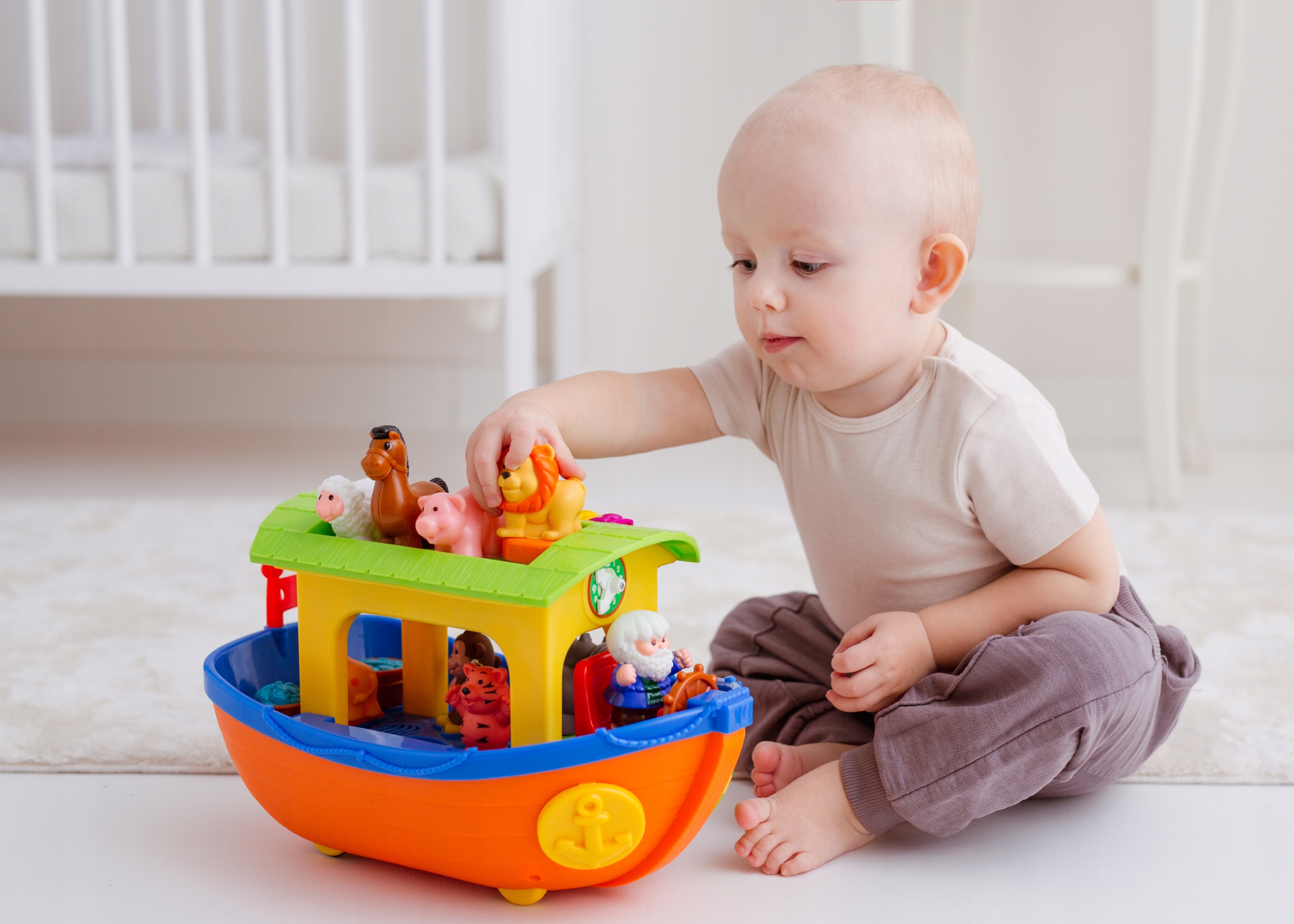 – sorter dla zwierzątek (przy dopasowaniu zwierzątko nagrodzi malucha realistycznym odgłosem lub rymowanką)