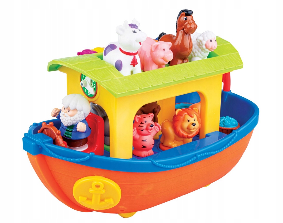 Wspaniała arka Noego zawiera 9 zwierzątek, które nagrodzą dzieci realistycznymi odgłosami bądź zabawną rymowanką za każdym razem, gdy odgadną prawidłowy kształt i umieszczą je w odpowiednim miejscu. Ster arki po przekręceniu wydaje realistyczne dźwięki. Zabawka posiada kolorowe mini pianinko, na którym można zagrać własną kompozycję. Istnieje możliwość doczepienia sznureczka do arki za pomocą którego może być prowadzona przez maluszka. Arka podczas jazdy imituje ruchy „płynącej na falach łodzi”.