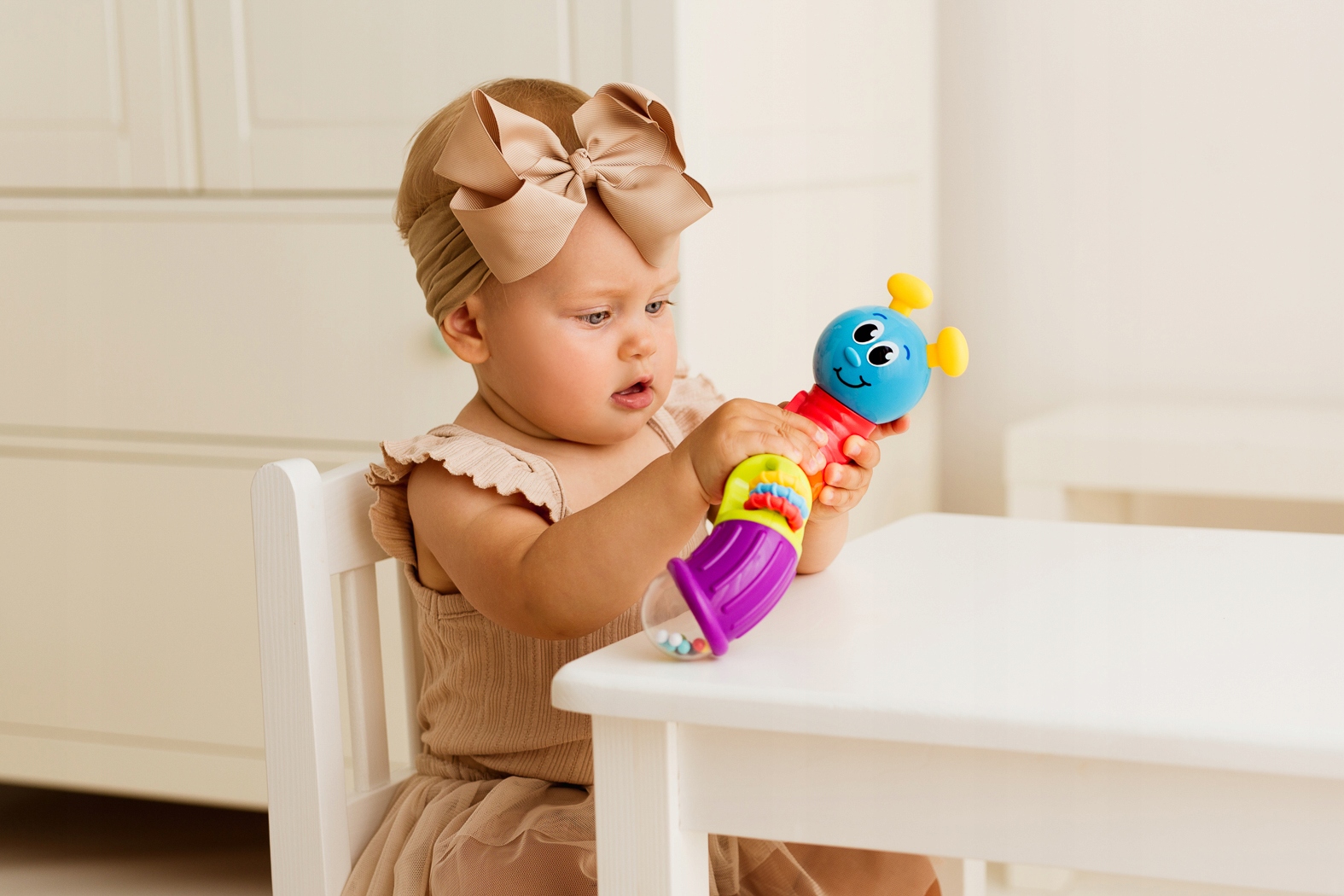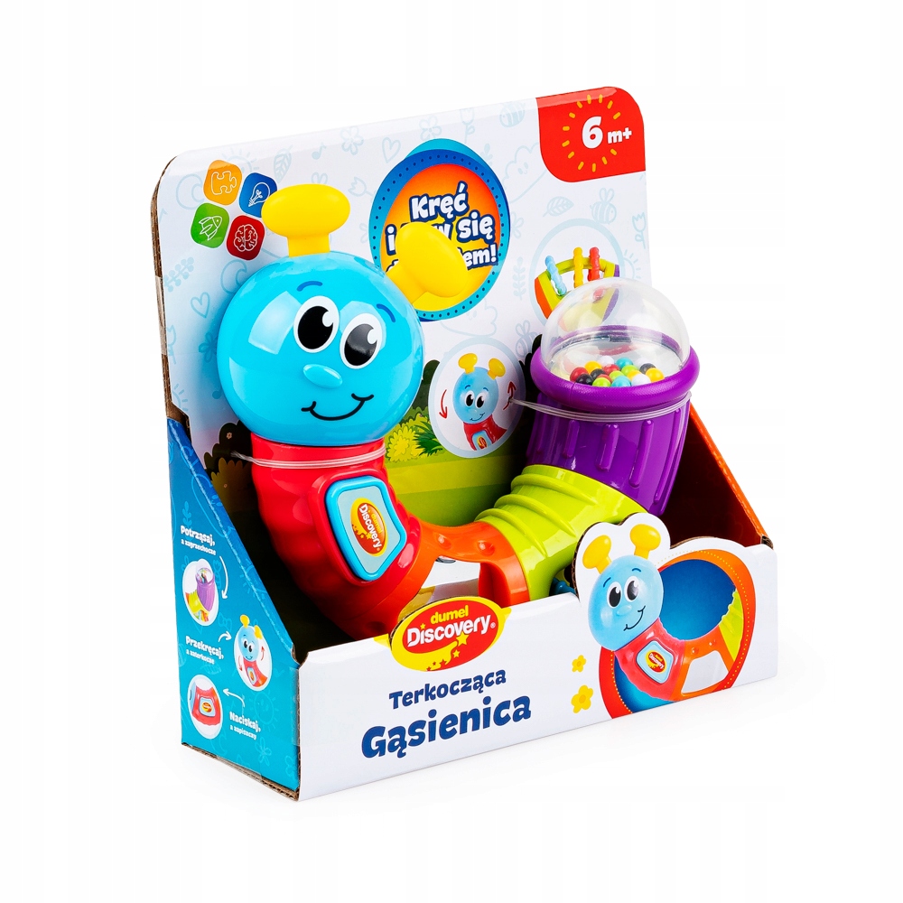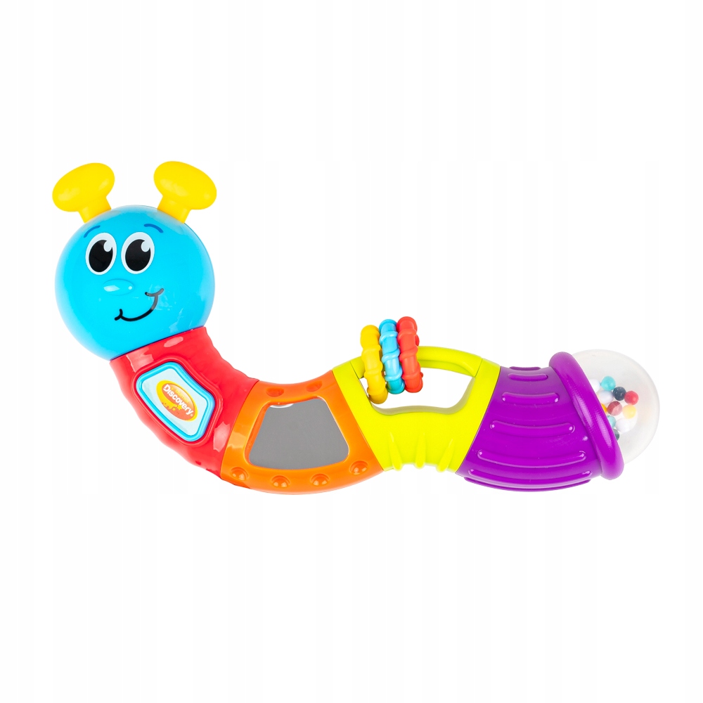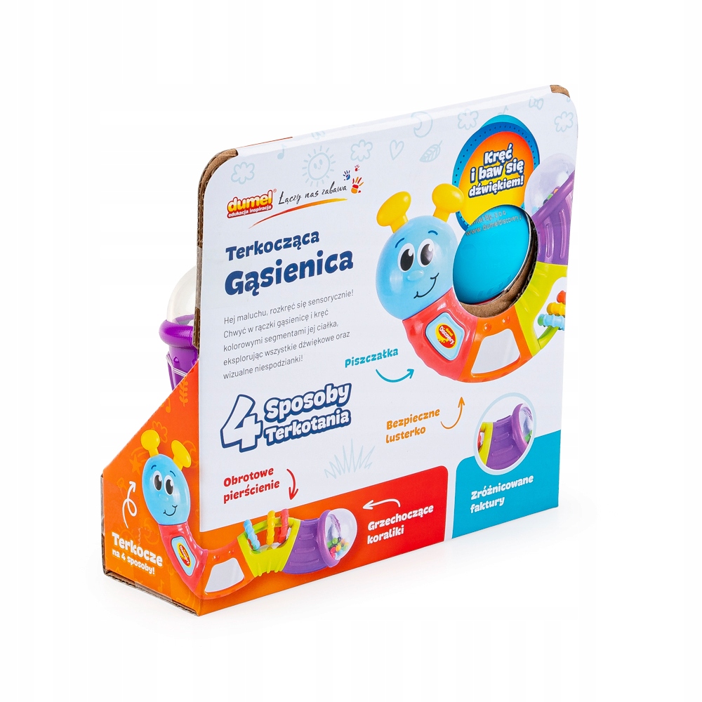 W zależności od tego, który z kolorowych segmentów jej ciałka przekręcisz, usłyszysz innego rodzaju terkotanie. Dodatkowo, zabawka wyposażona jest w piszczałkę oraz grzechotkę, a także ruchome kółeczka i bezpieczne lusterko. Poszczególne elementy zabawki różnią się kolorem oraz fakturą. Gąsienica dostarcza bodźców, angażujących zmysły malucha do poznawczej zabawy! Dotyk, poprzez różnice powierzchni, słuch, przy pomocy wielu dźwięków, a także wzrok, za sprawą soczystych kolorów zabawki.