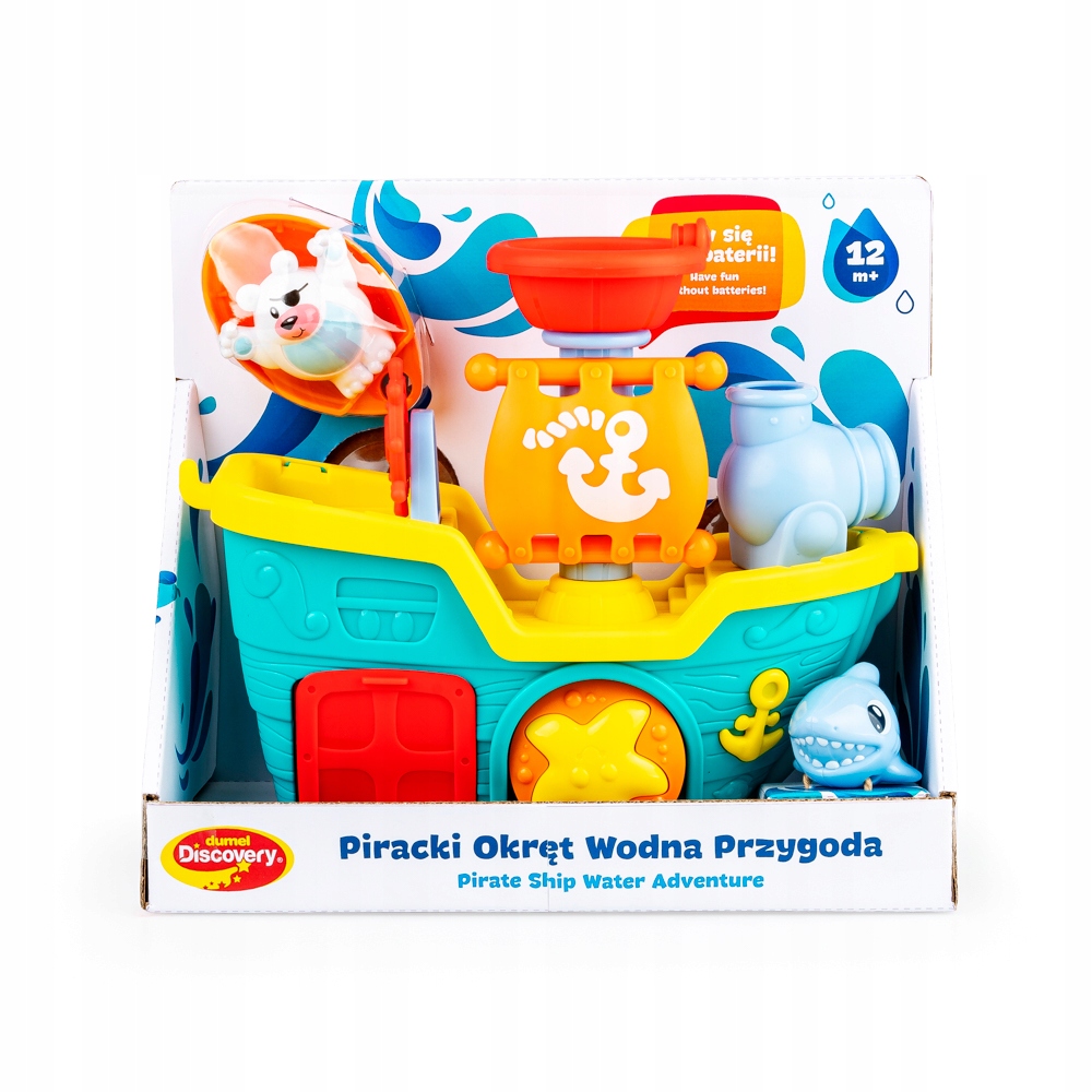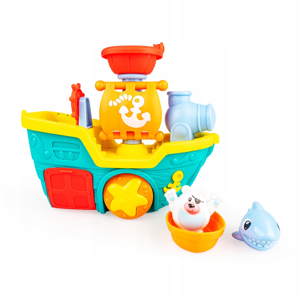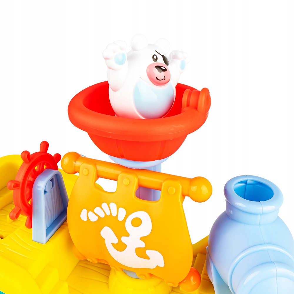 Piracki okręt zaprasza maluchy do radosnej zabawy w pluskanie, przelewanie i pryskanie wodą! Zabawka umili czas kąpieli, zapewniając najmłodszym wesołą rozrywkę, pełną niespodzianek. Znajdują się tu ruchome elementy, w postaci otwieranej klapki pod pokładem, z której wylewa się, wlana wcześniej do „bocianiego gniazda”, woda oraz koła ozdobionego rozgwiazdą, przez które także przelewa się woda, wprawiając je w ruch. Poza samym statkiem pirackim, w zestawie znajdziemy także szalupę do przelewania wody oraz dwie figurki: misia – pirata i rekina do odgrywania scenek i zabawy. Statek posiada przyssawki, umożliwiające przymocowanie zabawki do ściany wanny.