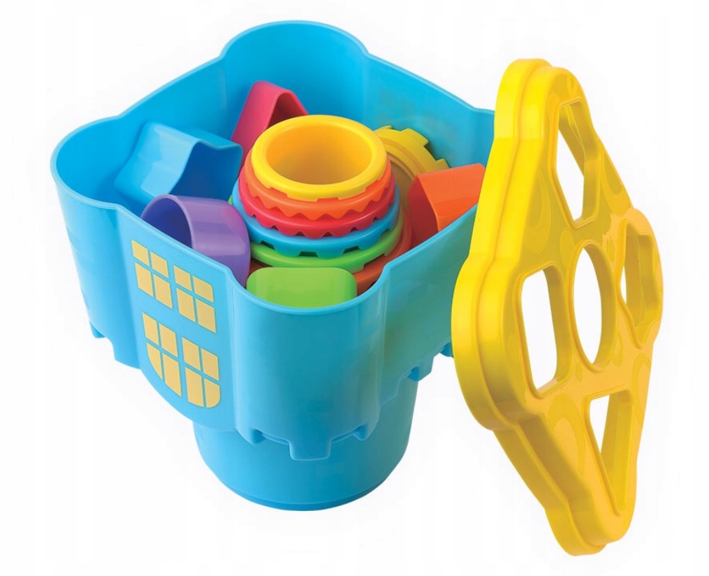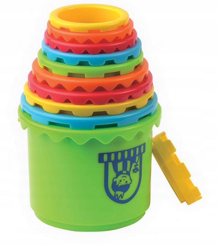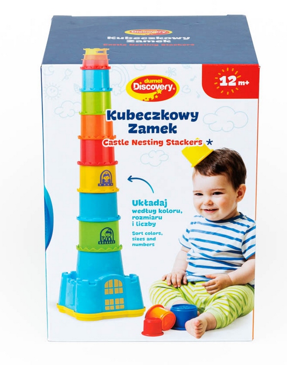 Dziecko ma do dyspozycji 11 elementów o różnej wielkości i kolorach, każdy oznaczony cyferką. Maluch może ułożyć z kubeczków wieżę, której wysokość to, aż 73 cm! Dzięki temu, że kubeczki są ponumerowane dziecko układa je po kolei i uczy się liczyć. Dodatkowo podstawa wieży ma kształt zamku, który może służyć jako pojemnik do przechowywania klocków. Nakładka na zamek pełni funkcję sortera, dzięki czemu maluch może dopasowywać klocki kształtem. Kubeczki posłużą także jako zabawka do piaskownicy. Zabawka wpływa na kształtowanie koordynacji wzrokowo-ruchowej, zdolności motorycznych, uczy dopasowywania kształtów oraz uczy liczb.