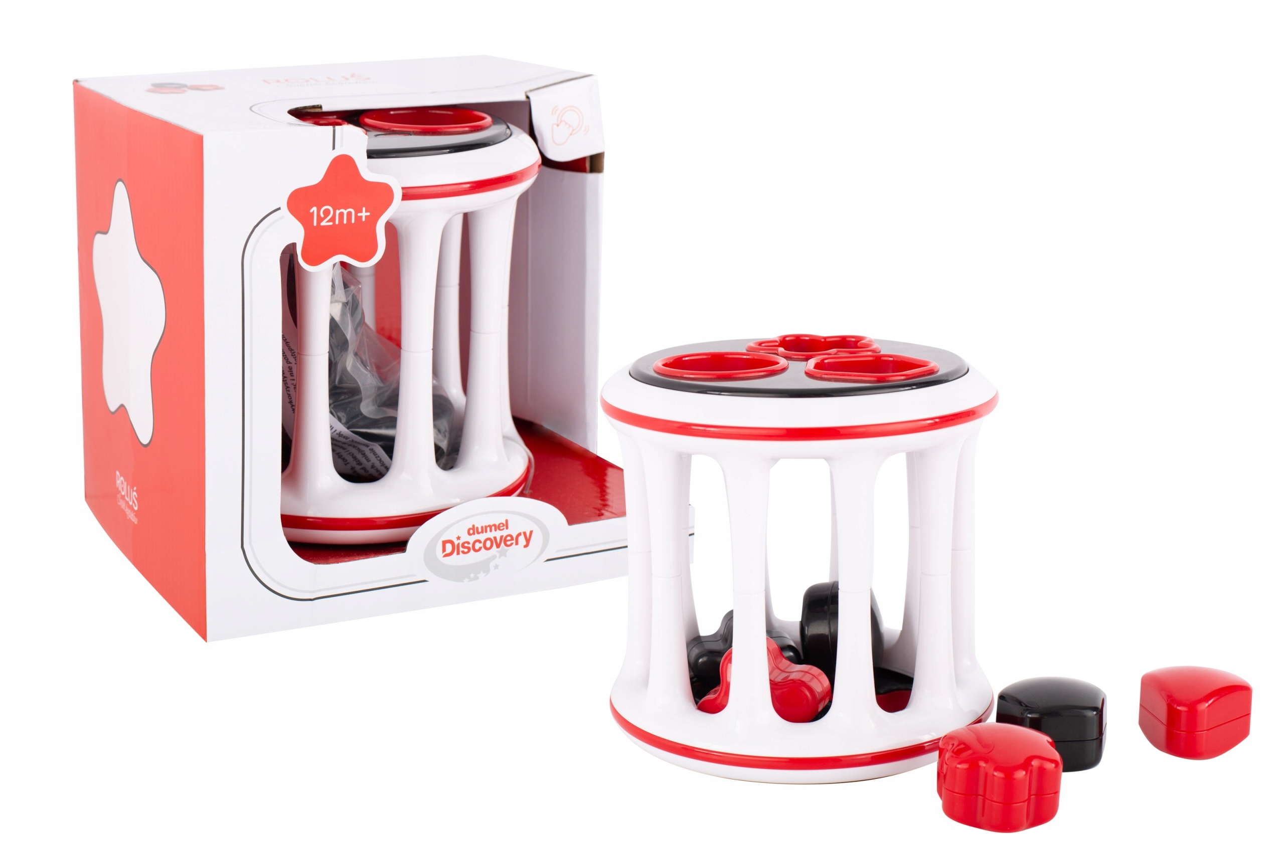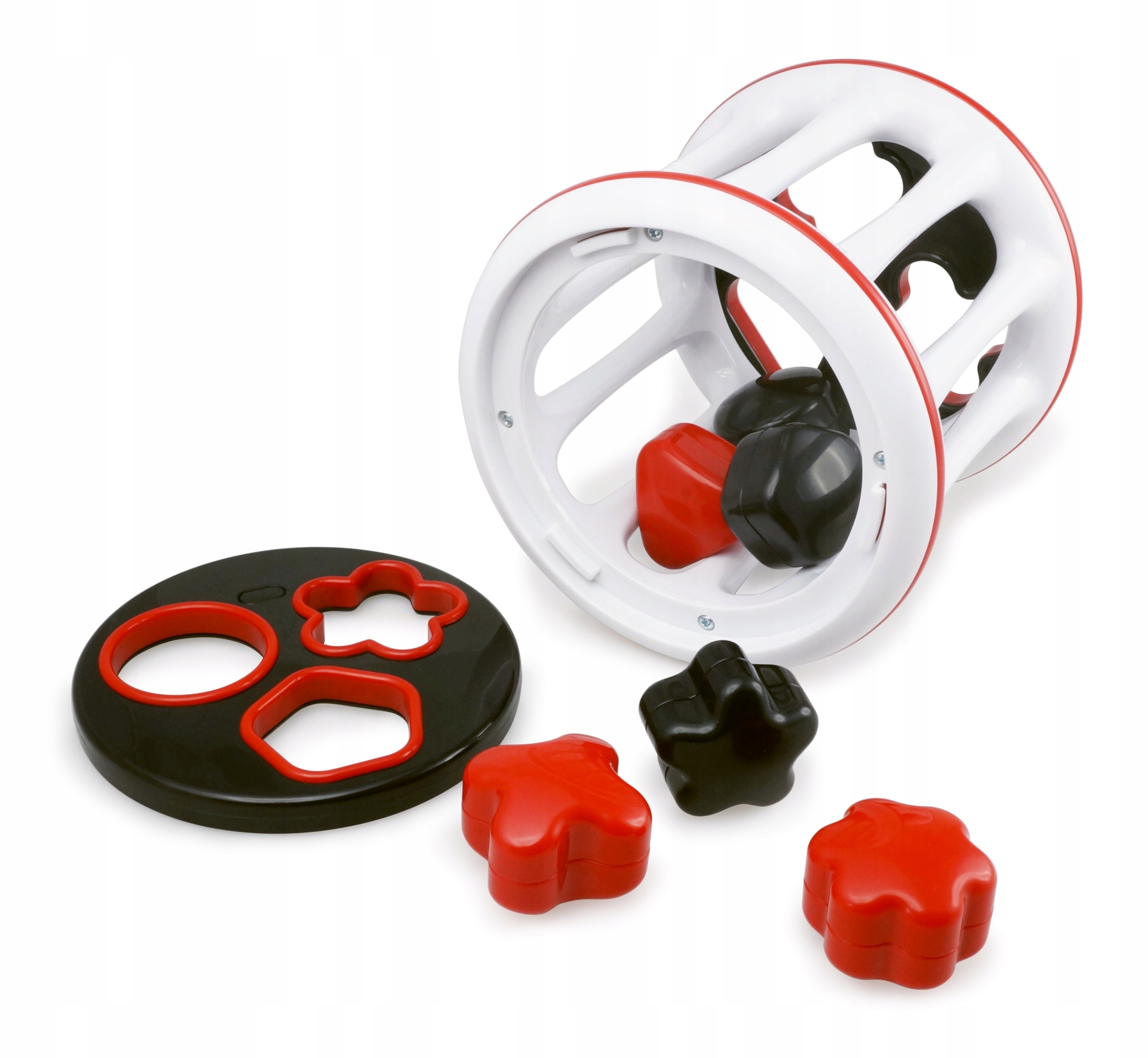 Kontrastowy, dwustronny sorter kształtów, odznaczający się nowoczesnym designem. W zestawie znajduje się 6 grzechoczących klocków, a zadaniem dziecka jest umieścić je w odpowiednich otworach. Gdy malec się z tym upora, możemy otworzyć ściankę sortera, aby wysypać klocki i rozpocząć zabawę od nowa.