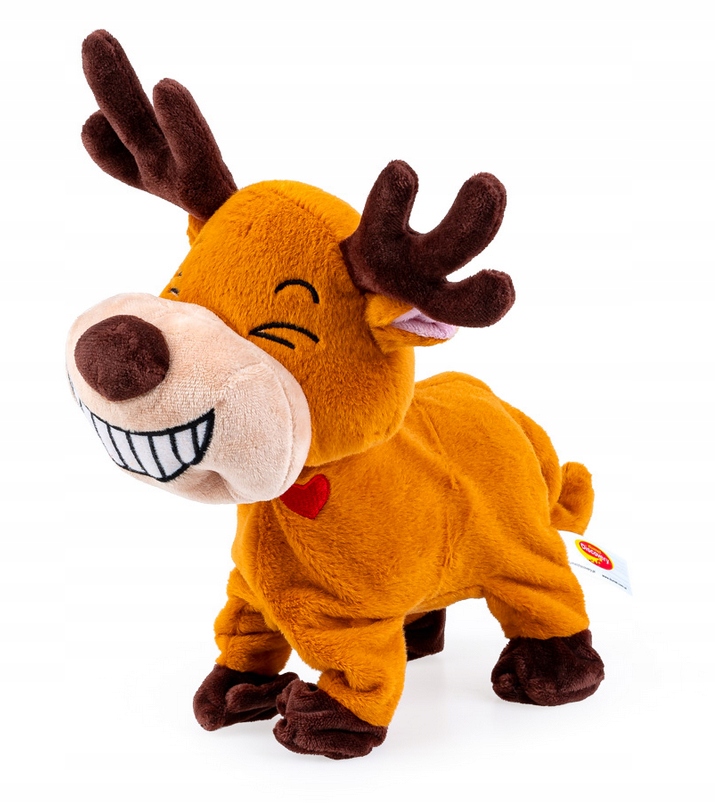 Uroczy wesołek zanosi się śmiechem, wierzgając przy tym raciczkami, stając na dwóch nogach i wykonując zabawne ruchy, a wszystko po to, aby rozśmieszyć malucha. Zwierzaczek posiada z boku, pod pyszczkiem, czerwone serduszko, odpowiedzialne za uruchamianie zabawki. Obserwuj „śmiechowe” popisy łosia i zaraź się od niego wesołością!