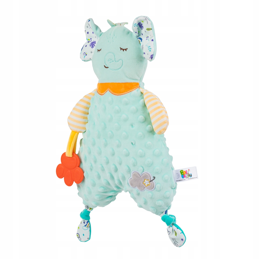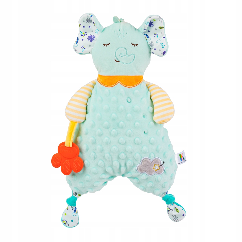 Zabawka uszyta została z materiałów różniących się kolorem, wzorem i fakturą, dzięki czemu stymulować będzie zmysły maluszka, pomagając mu tym samym w rozwijaniu zdolności poznawczych. Śpioszka zdobi haft w kształcie chmurki, para uroczych supełków oraz doczepiony do łapki gryzak z wypustkami, który z pewności przyda się dzidziusiowi podczas ząbkowania. Spłaszczona, mięciutka forma czyni ze słonika wymarzoną przytulankę.