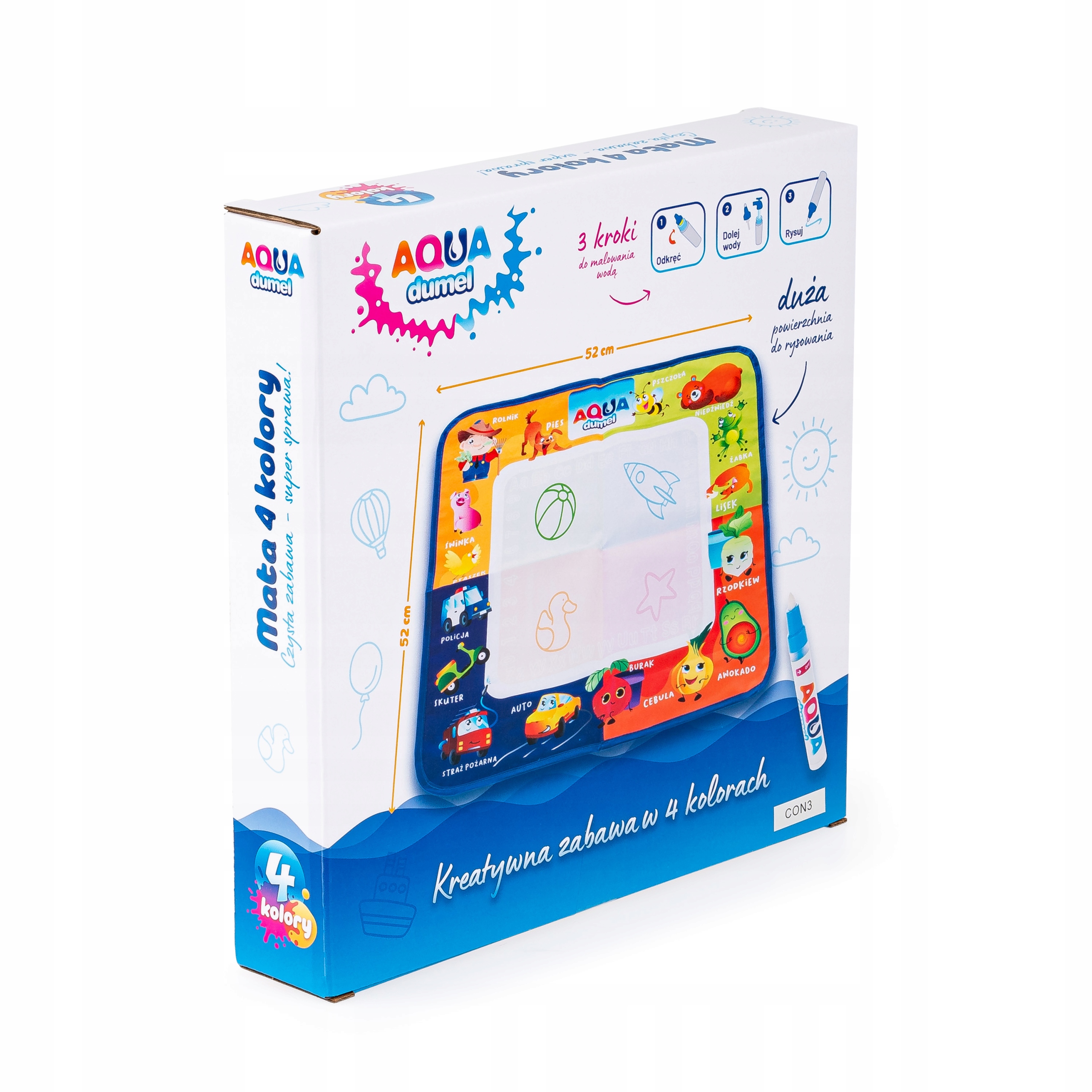 Mata do malowania podzielona jest na 4 pola kolorystyczne, co umożliwia tworzenie barwnych rysunków. Jej krawędź ozdobiona jest wesołymi, obrazkami oraz ich nazwami, dzięki czemu dzieci mogą poznawać nowe wyrazy. W zestawie znajduje się specjalny mazak, który, po napełnieniu wodą, będzie malował po macie. Kiedy mata wyschnie, obrazek zniknie, jak zaczarowany!