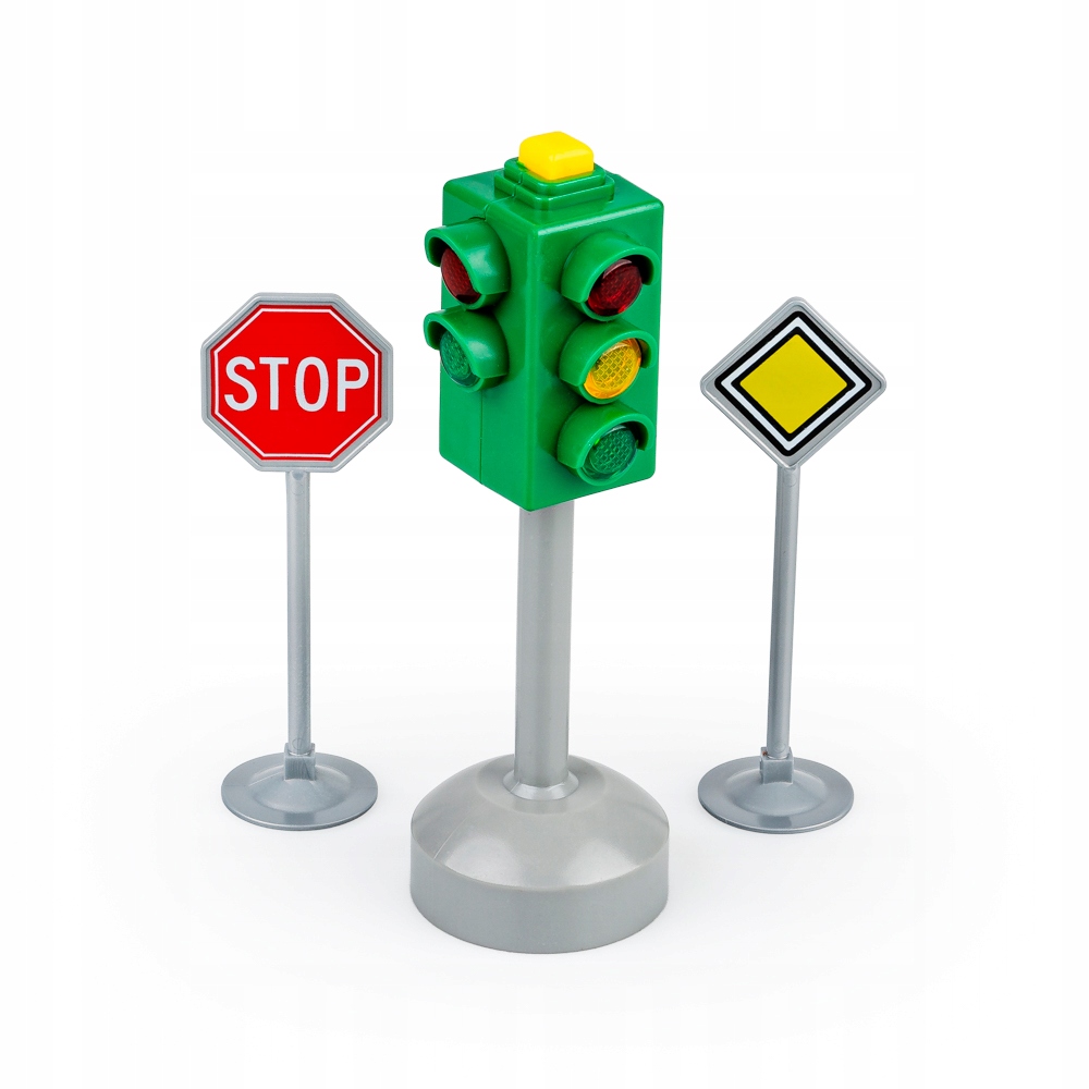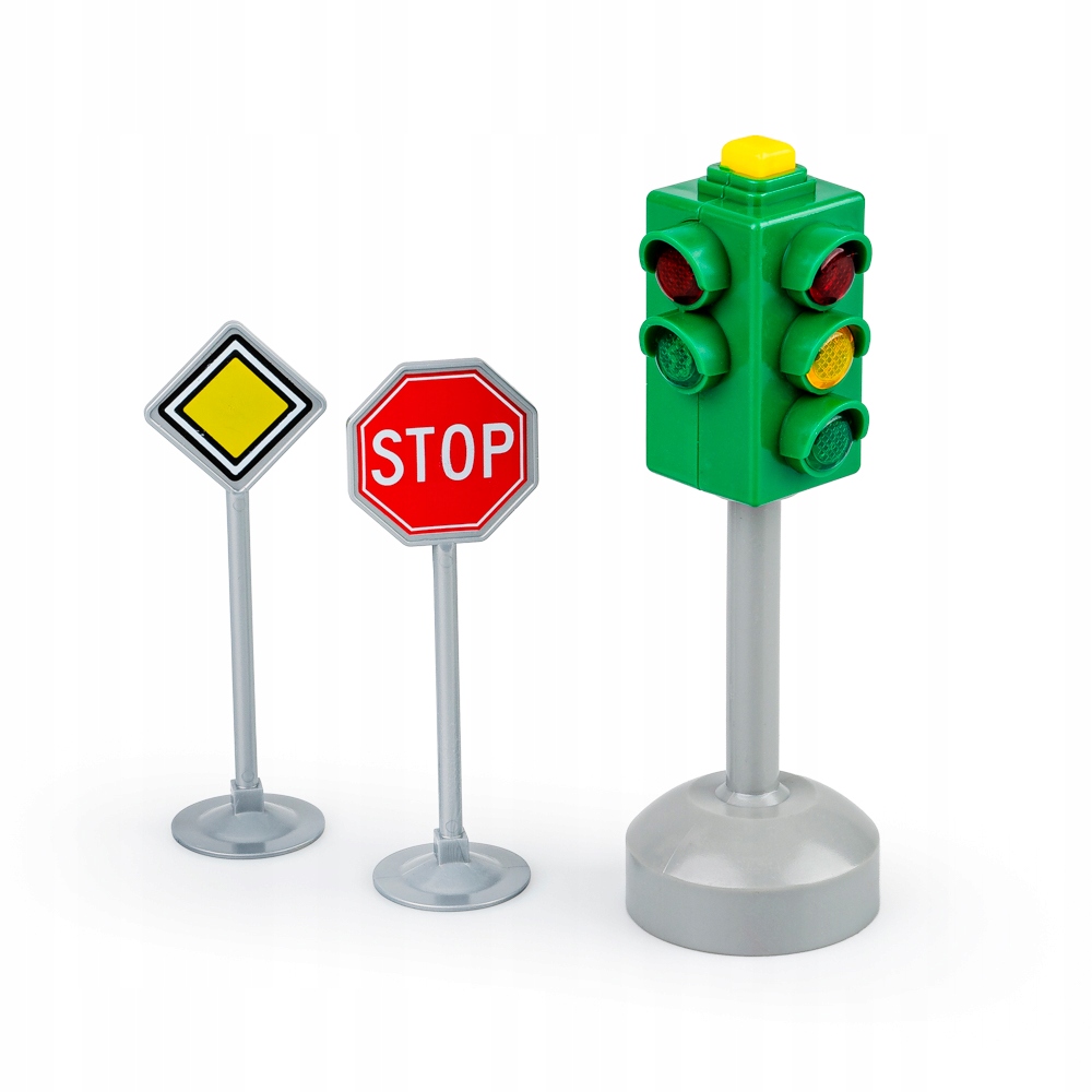 Dwustronny sygnalizator wyposażony został w praktyczny przycisk, który uruchamia światełka. Gdy z jednej strony świeci się światełko w kolorze czerwonym, z drugiej sygnalizator wskazuje światełko w kolorze zielonym i na odwrót. Ta praktyczna zabawka pozwoli małym miłośnikom motoryzacji wcielić się w rolę uczestnika ruchu drogowego, zapoznając ich przy tym z działaniem sygnalizacji świetlnej! W zestawie poza sygnalizatorem na baterie znajdują się dwa znaki drogowe.