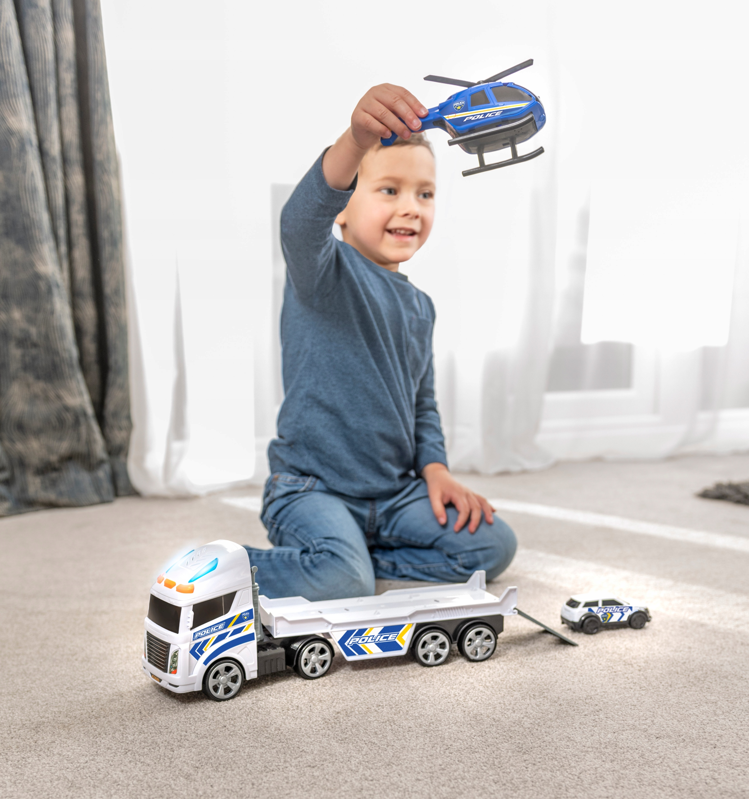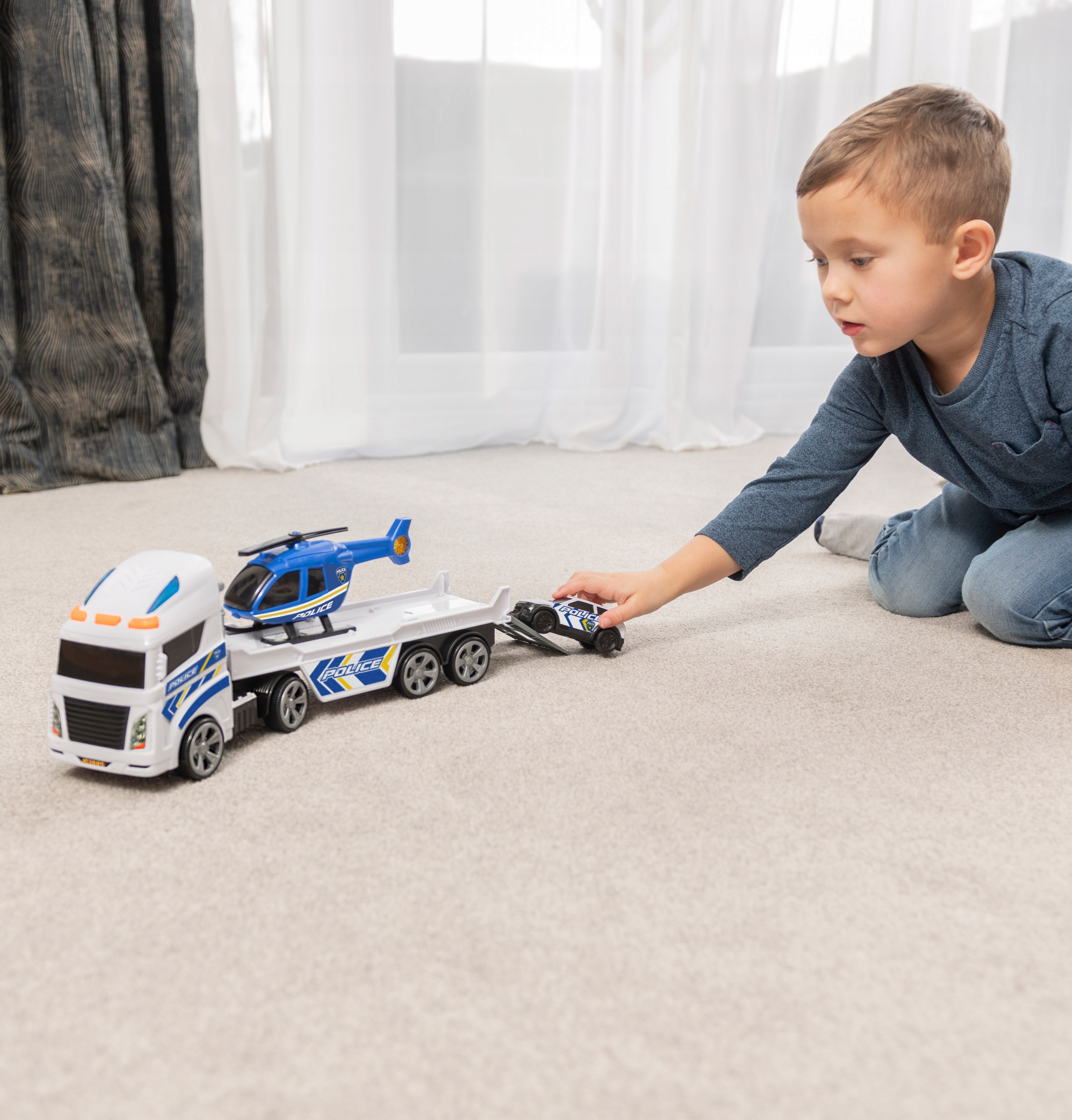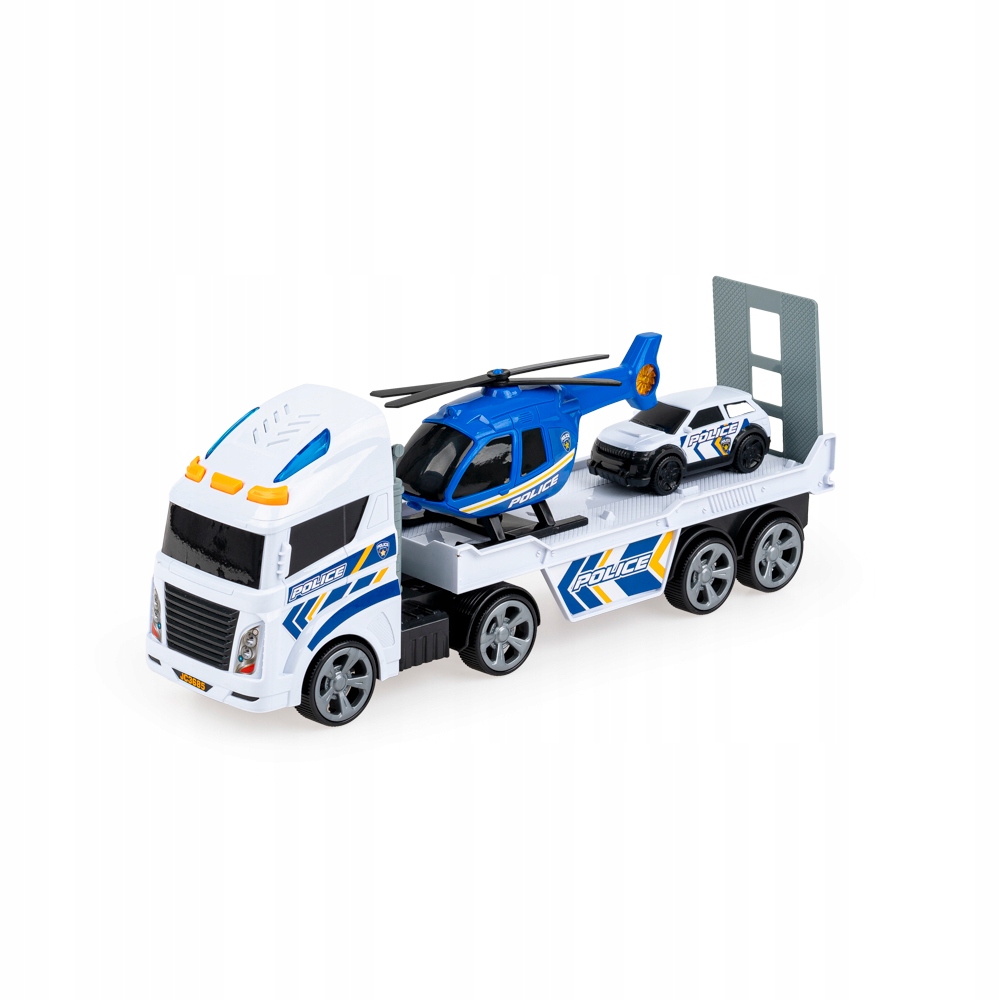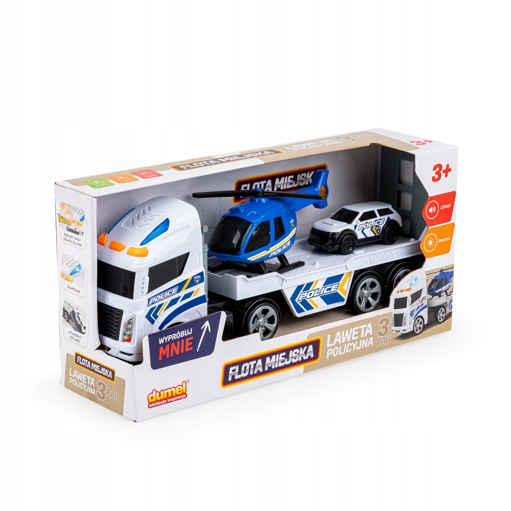 – w zestawie 3 pojazdy: laweta na baterie, helikopter, samochód policyjny;