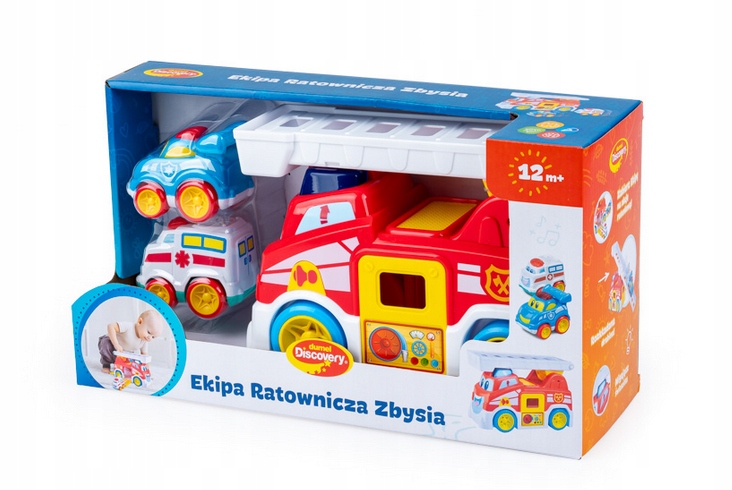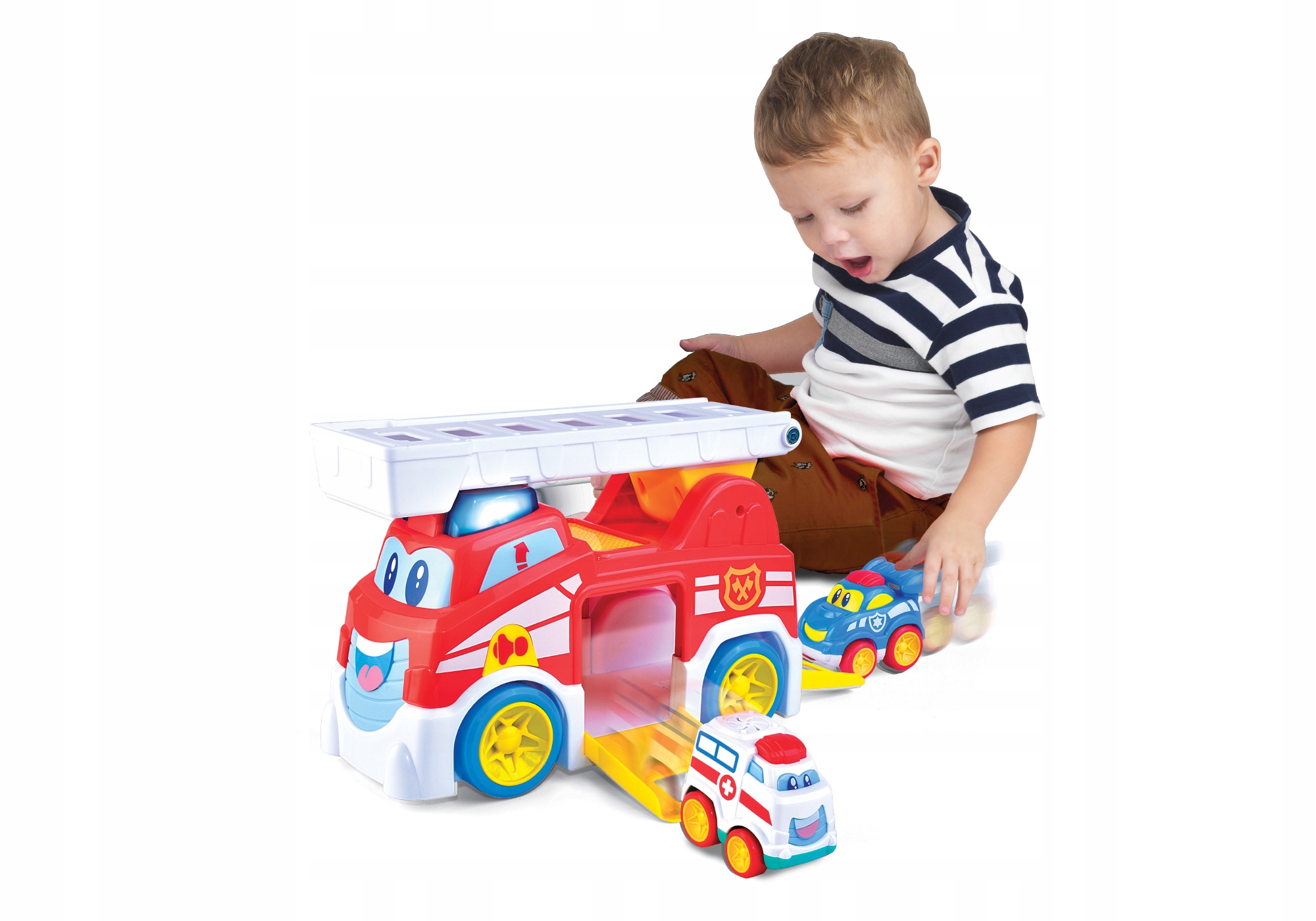 Wciel się w rolę strażaka i razem z tymi uśmiechniętymi samochodzikami przeżyj niesamowitą przygodę rozwijając przy tym własną wyobraźnię. Największy z pojazdów- Zbysio posiada na dachu rozsuwaną drabinę oraz otwierane drzwiczki. W jego wnętrzu kryją się dwa mniejsze autka. Zbysio posiada z boku aktywny przycisk, który uruchamia realistyczny dźwięk i światełko.