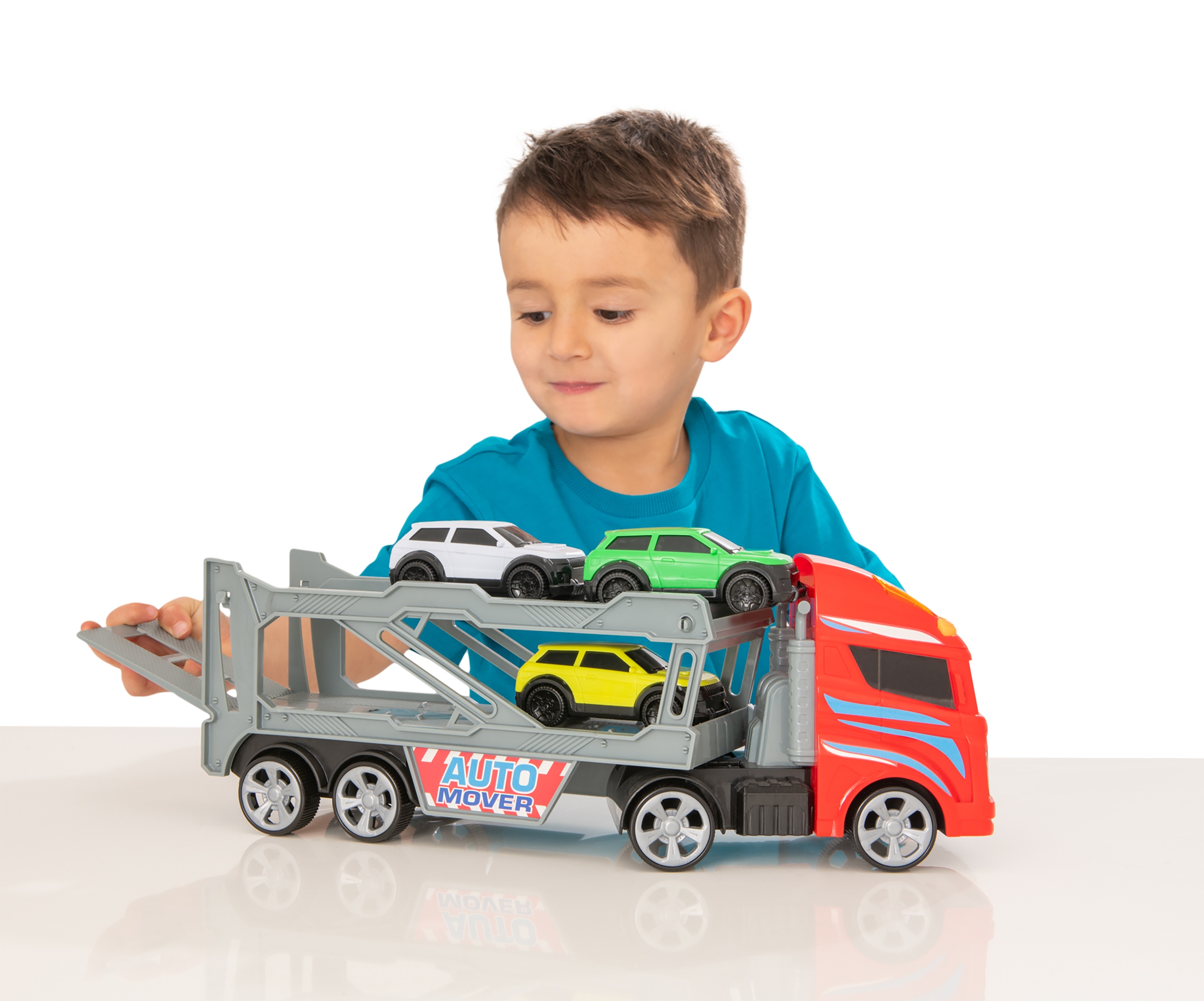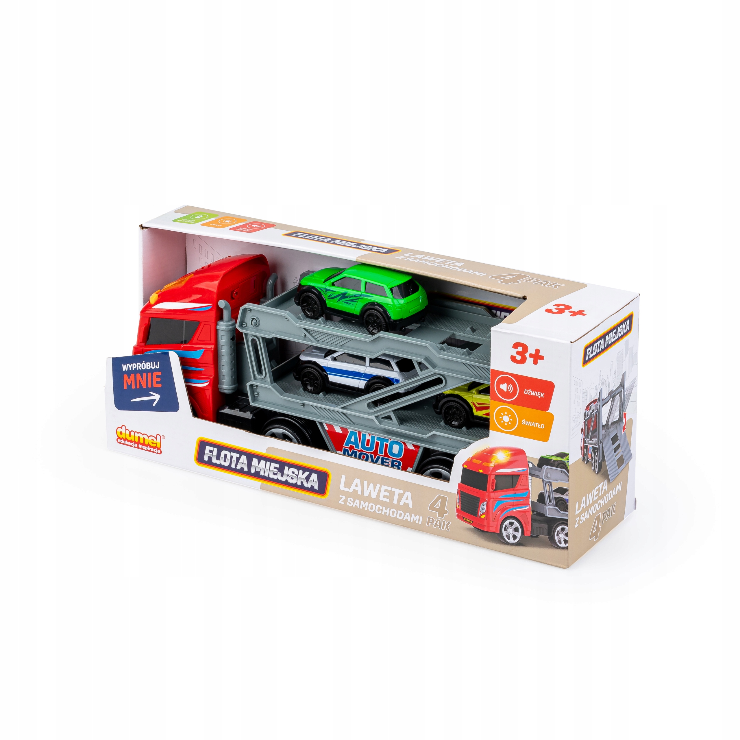 Znajdziemy tu dużą, dwupoziomową lawetę, która wiezie 3 samochody. Laweta posiada opuszczany najazd, a także wyposażona jest w światełka i realistyczne odgłosy. Taki zestaw z pewnością zadowoli każdego młodego miłośnika czterech kółek i jego kolegów!