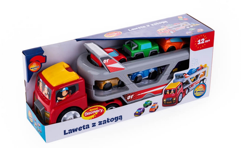 W zestawie znajduje się duża laweta ze światełkami, dźwiękami i melodią oraz 6 małych samochodzików, które mieszczą się idealnie na dwóch poziomach lawety. Każdy z samochodów ma inny kształt i kolor, więc bez trudu je odróżnisz. Laweta została wyposażona w rampę z opuszczanym wjazdem, co ułatwia samochodzikom wjazd „na pokład” i zajęcie miejsca na jednym z poziomów.