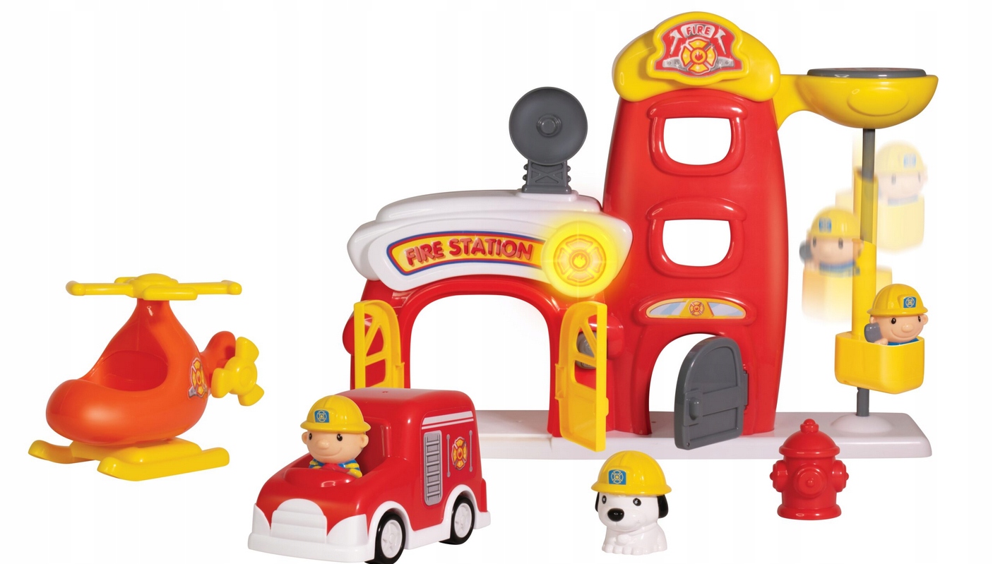 Przeżyj wspaniałą przygodę z zestawem figurek do zabawy w odgrywanie ról. Poza strażakami i ich dzielnym pieskiem – ratownikiem, znajdziesz tu stację strażaków, wóz strażacki, helikopter, a nawet hydrant. Stacja wyposażona jest w przycisk, uruchamiający lampkę i sygnał alarmowy. Specjalna winda umożliwia strażakom szybki zjazd na dół.