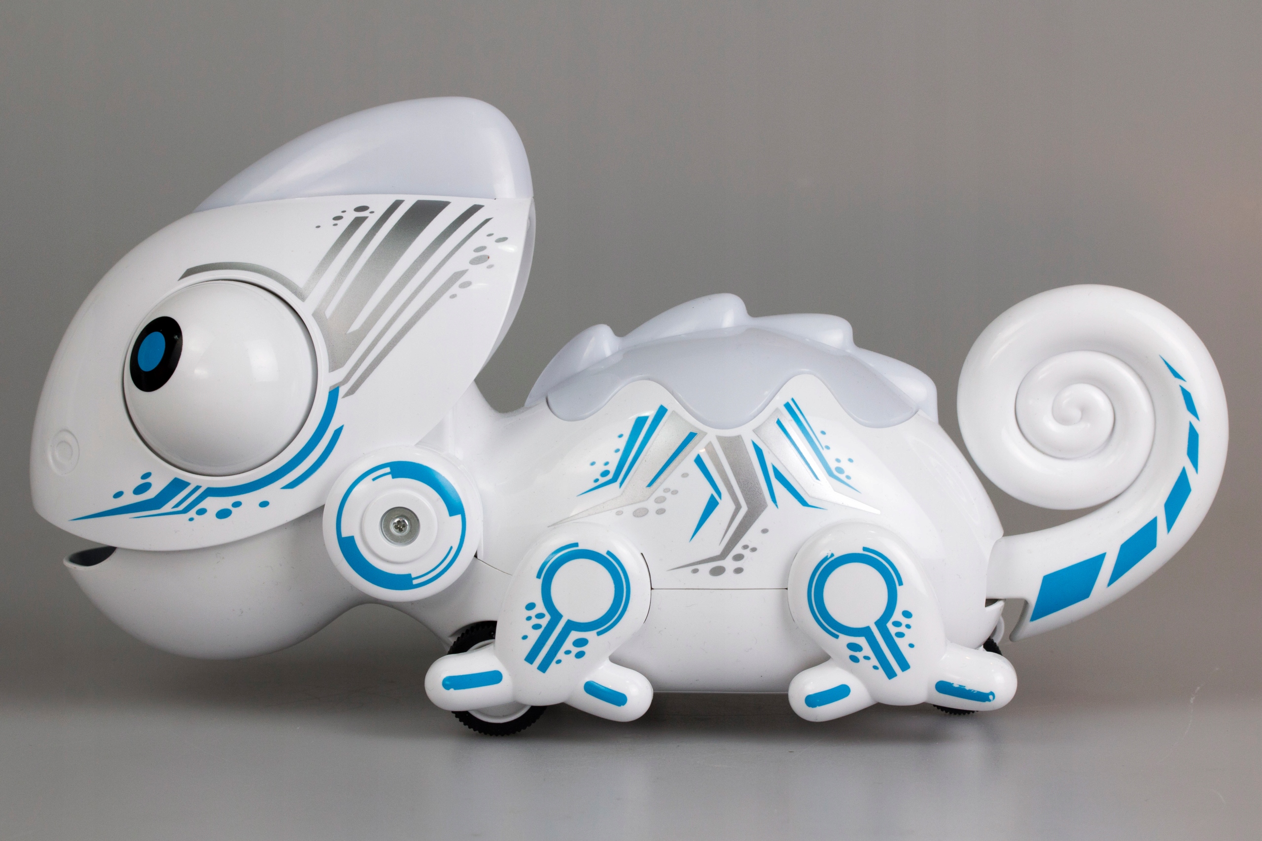 Kameleonem możemy sterować za pomocą pilota. Potrafi on jeździć we wszystkich kierunkach, a gdy zbliżymy go do jednego z dołączonych do zwierzaka krążków z przysmakiem i naciśniemy przycisk, jego język wystrzeli, złapie jedzonko i połknie! Jeśli znudzi nam się wygląd zabawki, możemy zmienić w dowolnej chwili jej kolor, naciskając na umieszczony na pilocie przycisk z paletą i pędzelkiem. Zaopiekuj się tym zabawnym stworkiem i spróbuj zebrać wszystkie krążki, aby go nakarmić!