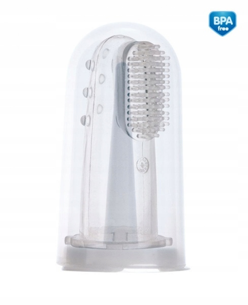 Miękka szczoteczka z wypustkami nakładana na palec idealnie nadaje się do mycia pierwszych ząbków. Wykonana została z silikonu wolnego od BPA. Można ją stosować u dzieci, które jeszcze nie mają ząbków do masażu i codziennej higieny dziąsełek. Umożliwia delikatne czyszczenie bez ryzyka ich uszkodzenia. Konstrukcja szczoteczki umożliwia dotarcie w trudno dostępne miejsca. W zestawie higieniczny pojemnik do przechowywania.