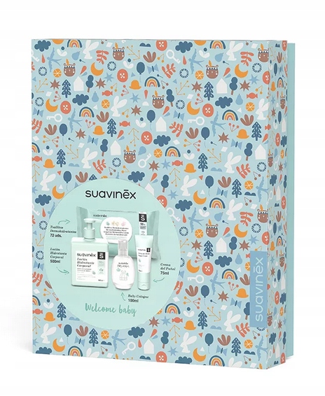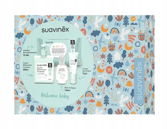 Box upominkowy Suavinex z produktami do pielęgnacji niemowląt.