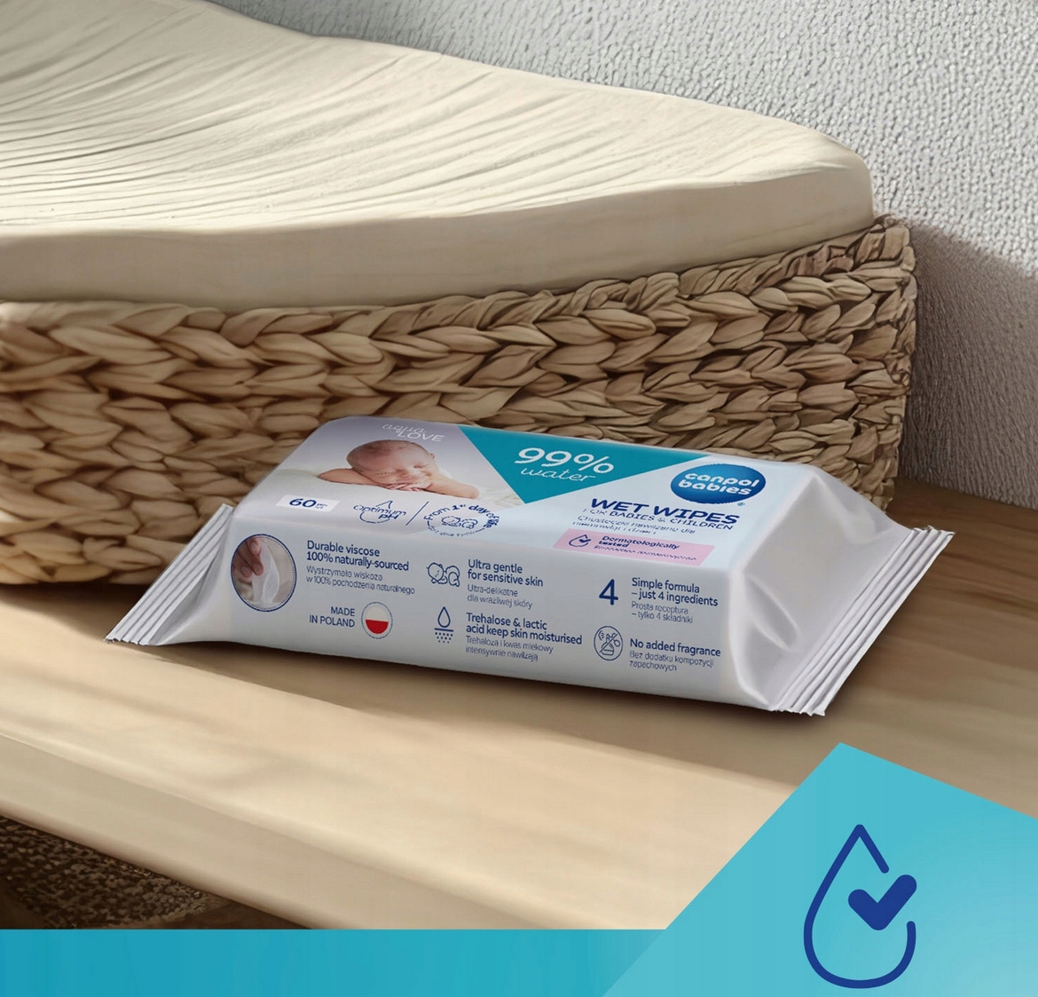 Prosta receptura na bazie 99% czystej wody i 4 składników aktywnych, bez dodatków zapachowych, została przebadana dermatologicznie i jest bezpieczna już od 1. dnia życia. Wzbogacona w substancje aktywne – trehalozę, która intensywnie nawilża i łagodzi skórę oraz kwas mlekowy, który silnie nawilża skórę, odbudowuje pH skóry i przywraca jego optymalny fizjologiczny odczyn.