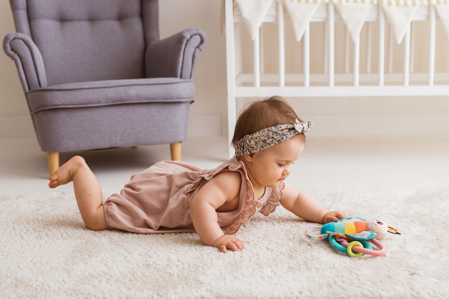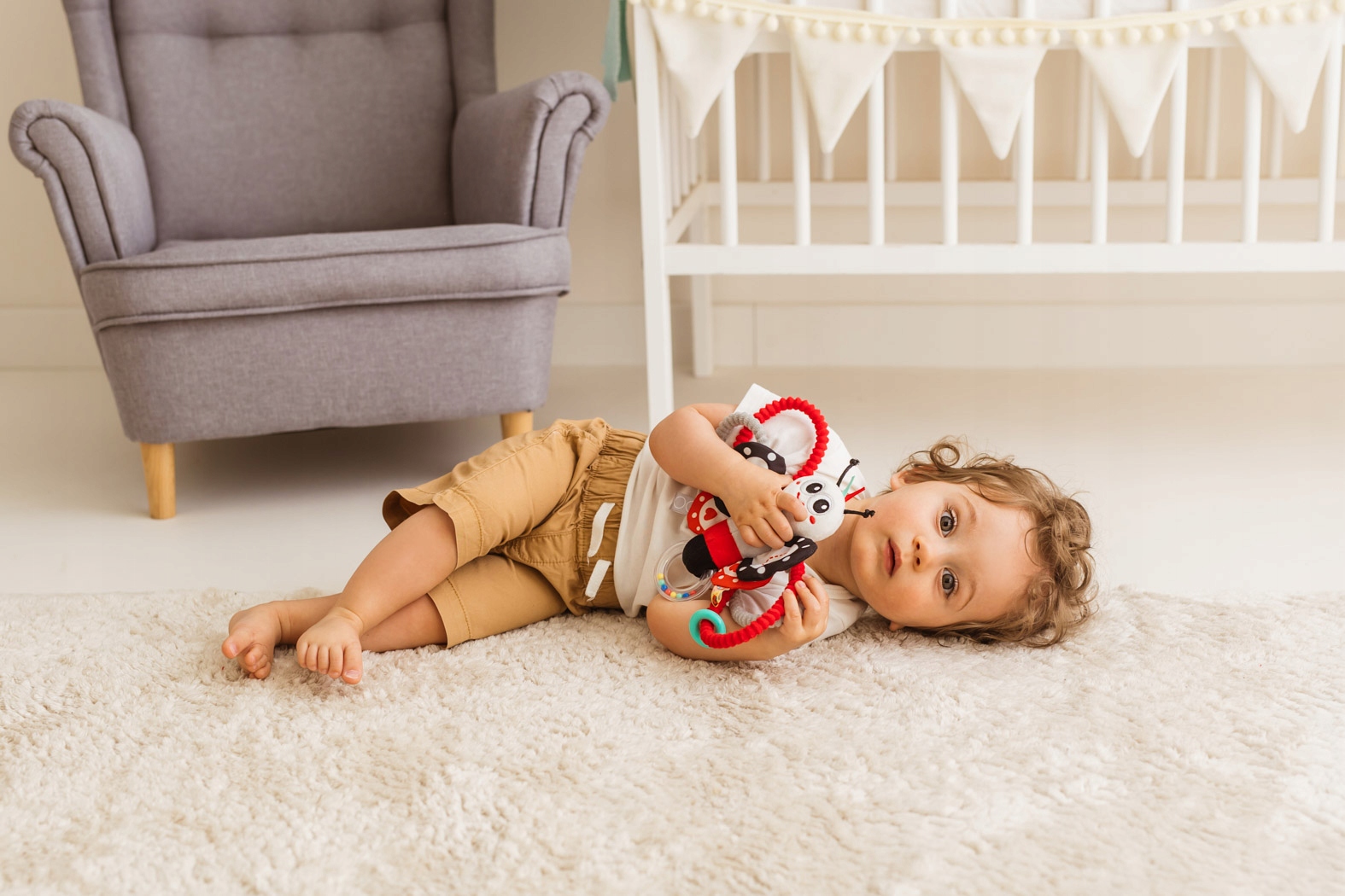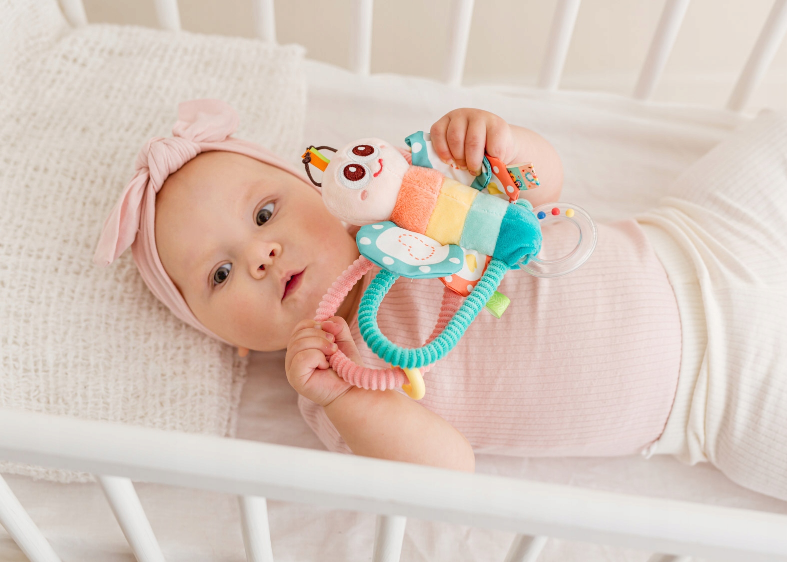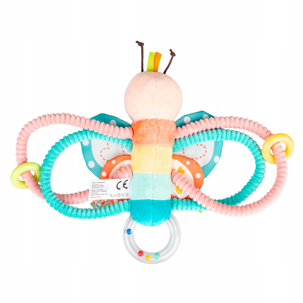Kolorowy motylek wyposażony został w kryty dzwoneczek, który wydaje uroczy dźwięk przy każdym potrząśnięciu zabawką. Kolorowe, fakturowane obręcze, które zdobią Tymka są elastyczne i dostosowane do małych rączek, co ułatwia najmłodszym chwytanie zabawki. Jakby tego było mało, Motylek posiada także grzechoczący element, a jest nim przezroczysty krążek, wypełniony koralikami. Zabawka uszyta została z materiałów o zróżnicowanych fakturach, co pozwala rozwijać zdolności poznawcze malucha, zachęcając go do odkrywania świata za pomocą zmysłów.