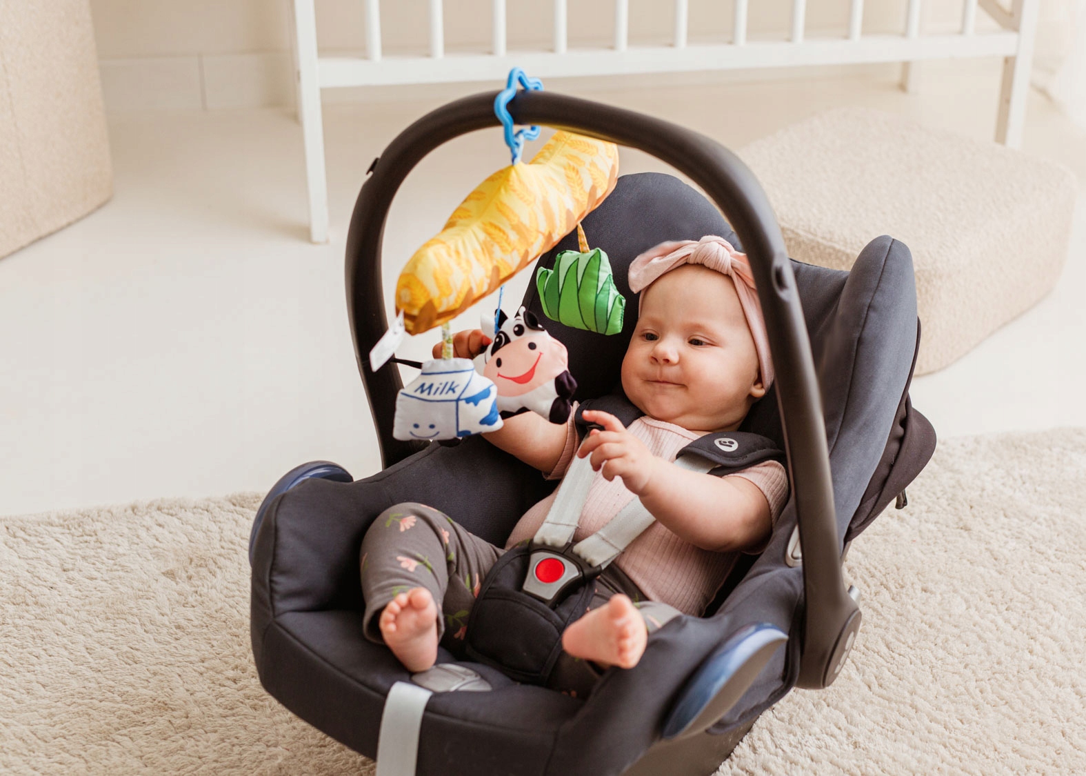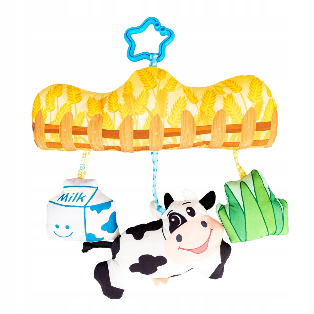 Znajdziemy tu, poza górnym panelem, ozdobionym kłosami pszenicy i płotkiem, krówkę, karton mleka oraz kępkę trawy. Wybrane elementy zabawiają na różne sposoby, dzwoniąc, grzechocząc lub piszcząc. Zabawka wyposażona jest w praktyczną zawieszkę, która pozwala na przymocowanie jej w dowolnym miejscu.