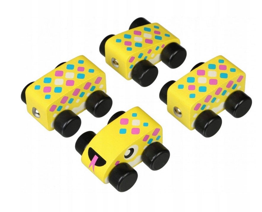 Zestaw składa się z 4 drewnianych elementów. Kółka są ruchome, więc dziecko będzie mogło przesuwać zabawkę. Rozwija wyobraźnię i zdolności motoryczne