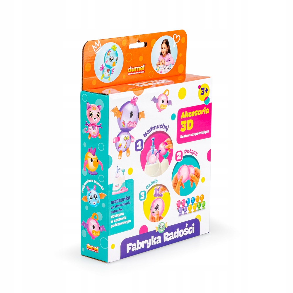 Zestaw akcesoriów 3D to uzupełnienie do zestawu podstawowego, Fabryka Radości – Balony. Znajdziesz w nim aż 170 elementów, a wśród nich nie tylko balony, ale też naklejki oraz trójwymiarowe ozdoby, takie jak skrzydełka, uszka czy łapki, z którymi „wyczarujesz” kolejne, balonowe stworki.