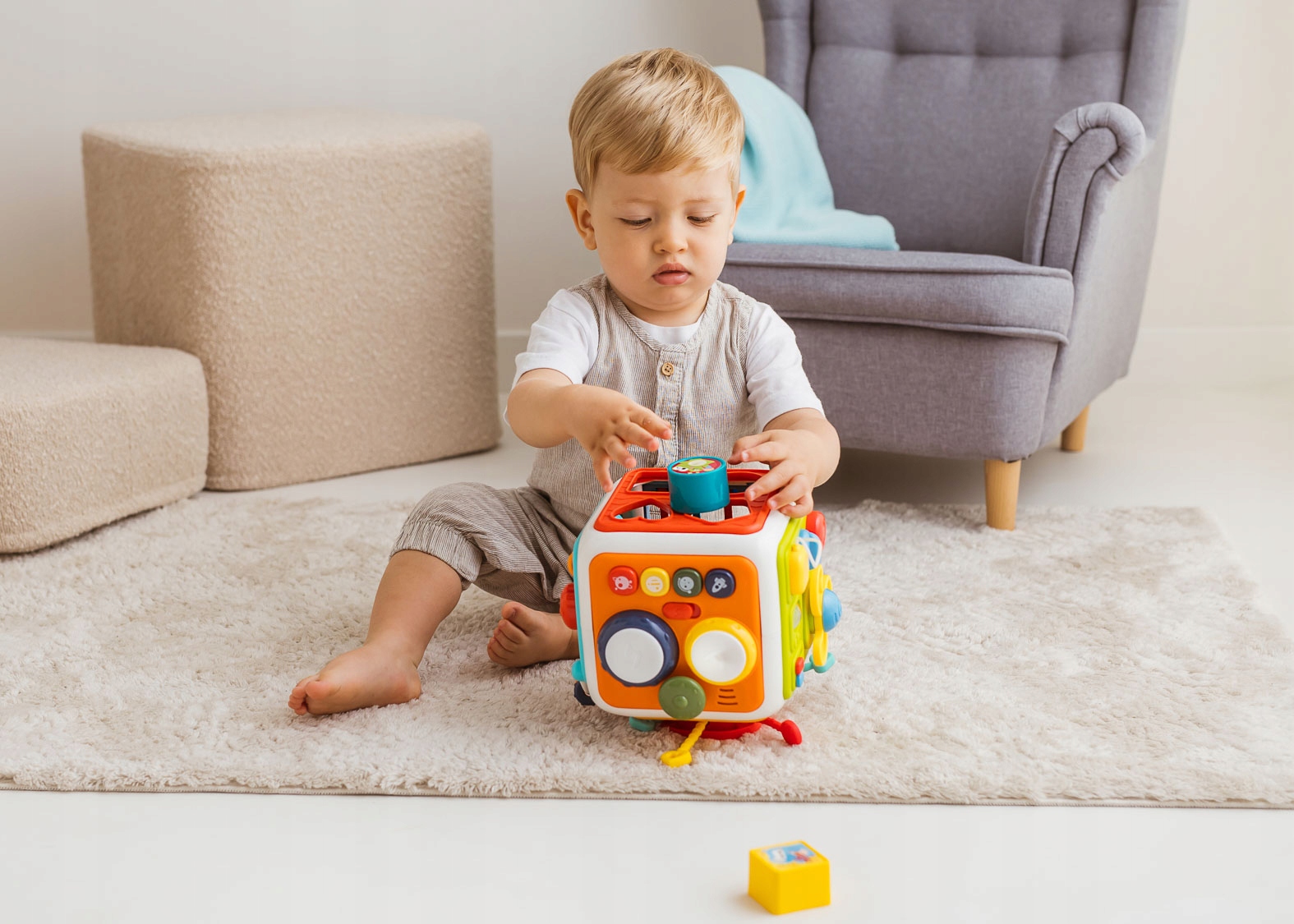 Każda ze ścianek to inna, kolorowa przygoda. Znajdziemy tu elementy do przesuwania, śmigło do obracania, sznureczki, przez które widać wnętrze zabawki, przyciski aktywujące dźwięk i podświetlenie bębenków, praktyczny, podnoszony uchwyt do przenoszenia kostki, a także najlepsze – odpinaną, dwustronną ściankę z trybikami do kręcenia i fakturowanymi linkami z wypustkami do przeciągania! Możliwość odpięcia ścianki, pozwala zabrać ją ze sobą w dowolne miejsce, aby wszędzie mogła towarzyszyć maluchowi.
