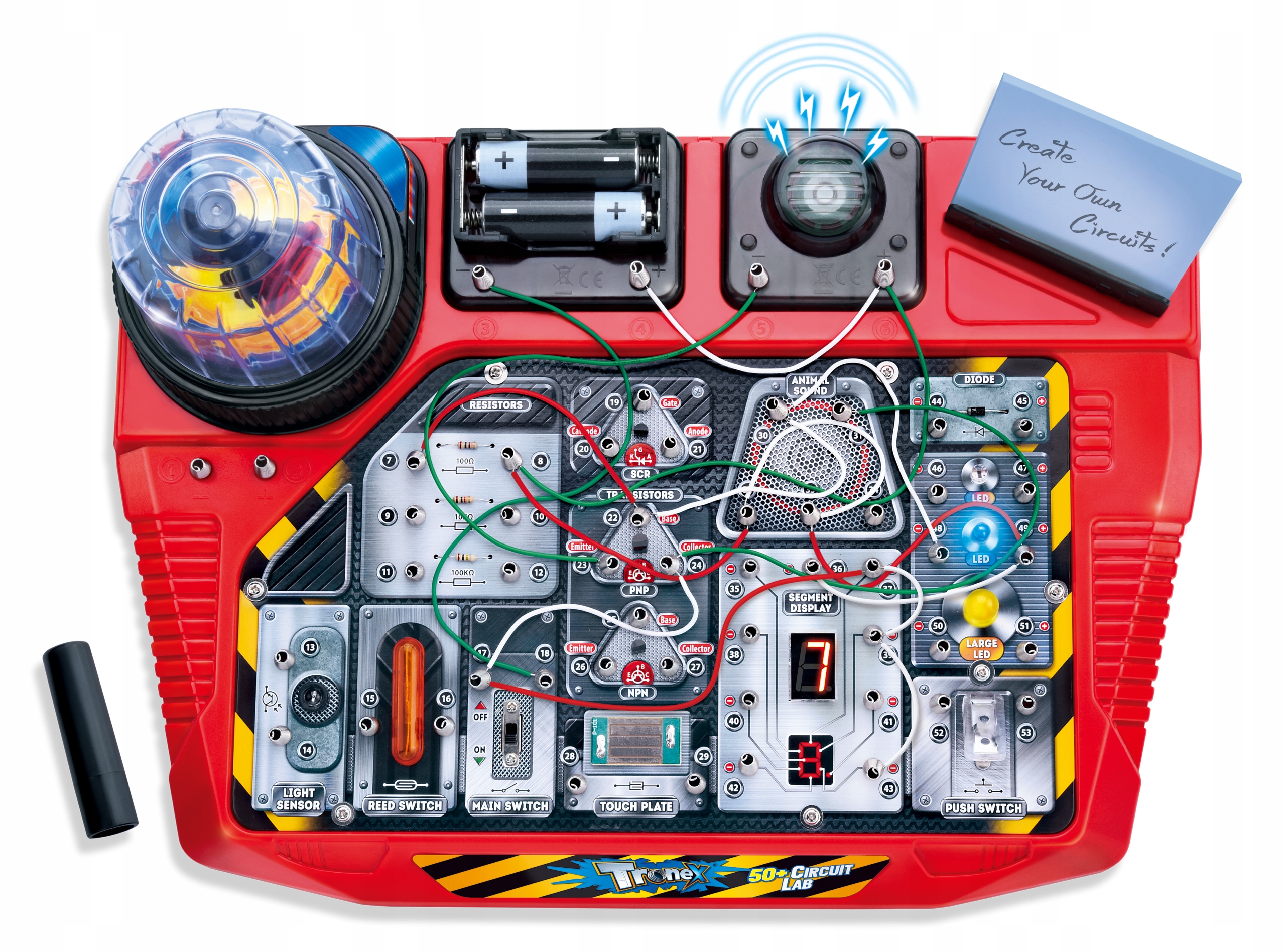 Ten duży zestaw pozwoli na przetestowanie aż 50. różnych połączeń, które w inny sposób oddziałują na cały układ. Baw się na trzy sposoby, poznając zależności magnetyczne, sterując oświetleniem i kontrolując styki. W zależności od zastosowanych połączeń uzyskasz inną reakcję, wywołując np. odgłos zwierzęcia, zapalając lampkę LED lub uruchamiając wirujące diody.