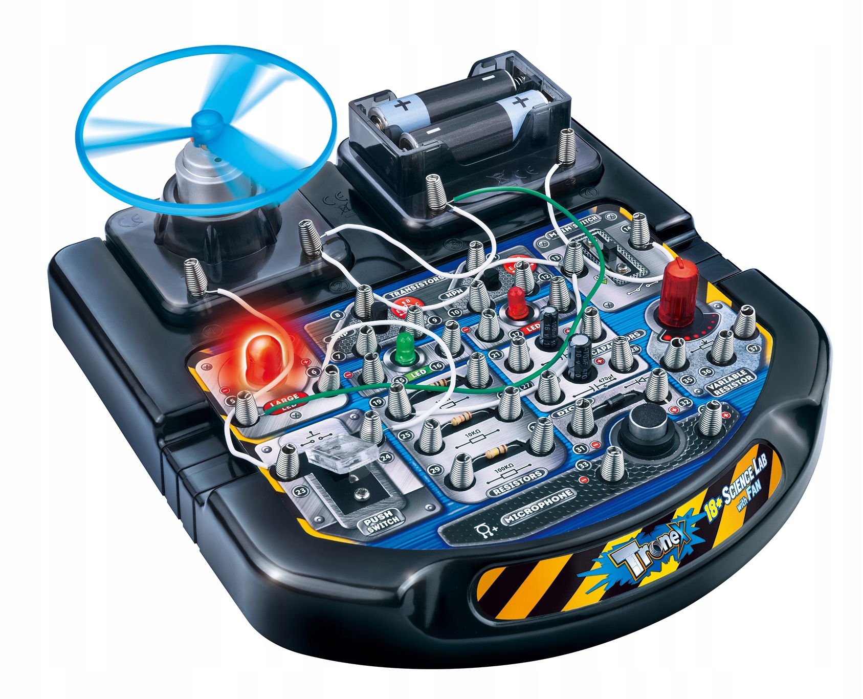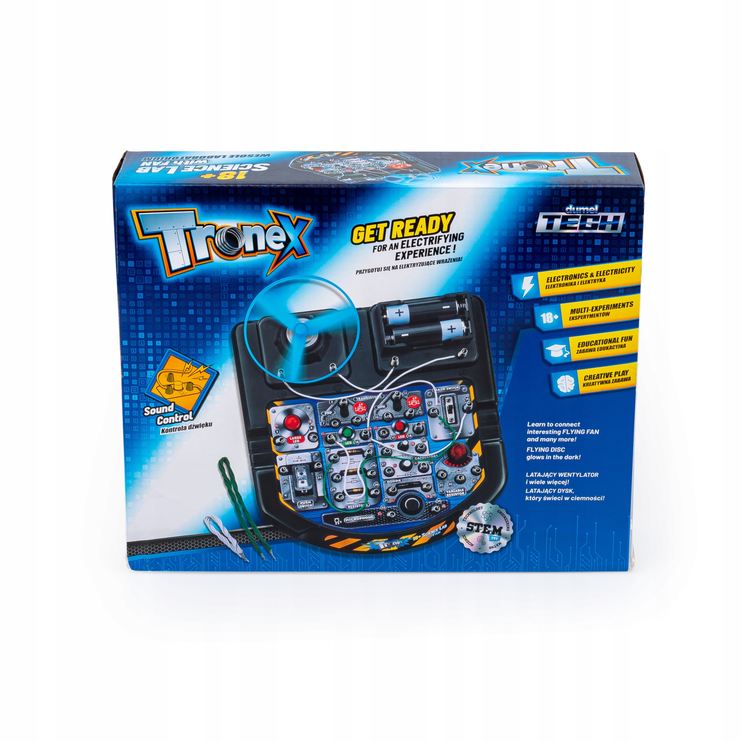 To duże, elektroniczne laboratorium daje możliwość wypróbowania różnych eksperymentów, np. latającego wentylatora. Wypróbuj różne kolejności łączenia kabelków, opisane w instrukcji obsługi, i sprawdź jaką reakcję urządzenia wywołasz.