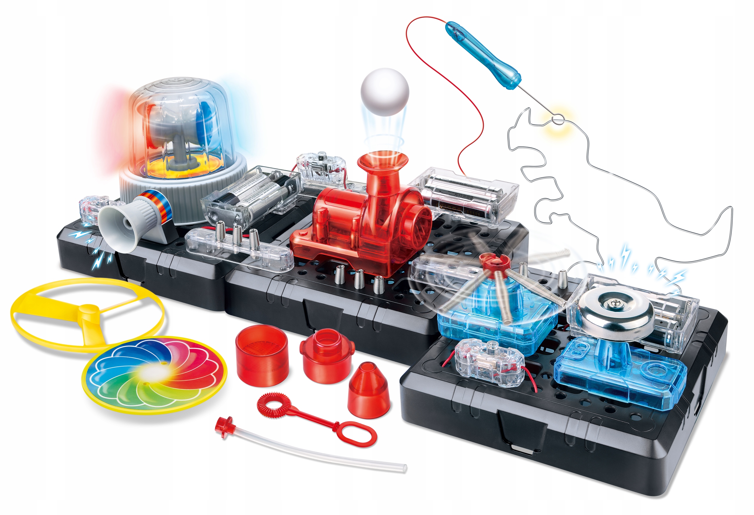 Duży zestaw do majsterkowania pozwoli poszerzyć wiedzę z zakresu fizyki, poprzez praktyczne doświadczenia, takie jak: filtr barwny, mini próżnia czy system alarmowy. W zestawie znajdziesz wiele elementów, z pomocą których przeprowadzisz własne eksperymenty.