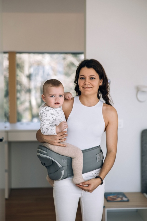 W pierwszych miesiącach, gdy stawy biodrowe dziecka są jeszcze w fazie rozwoju, niezwykle istotne jest noszenie dziecka we właściwej pozycji. Ta pozycja jest nie tylko najlepsza dla rozwoju bioder i kręgosłupa, ale także najwygodniejsza dla dziecka. Podparcie i położenie nóżek utrzymują kręgosłup dziecka we właściwej pozycji. Aby zapewnić wygodę noszenia i odpoczynku na kolanach, zagłówek zapobiega kołysaniu się głowy. Zapewnia prawidłowy sposób noszenia, gdyż nóżki dziecka pozostają w ergonomicznej pozycji M
