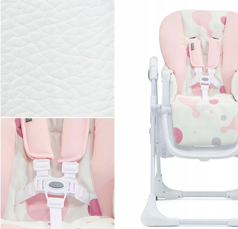 YUMMY ma miękkie, wygodne siedzisko z pokrowcem z ekoskóry. Łatwo je wyczyścić – nawet plamy po sosie pomidorowym nie będą problemem. Krzesełko ma 5-punktowe, regulowane pasy, które wyposażono w miękkie ochraniacze.