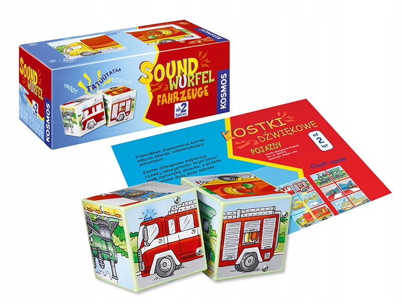 Kostki dźwiękowe, które wprowadzą nas w świat pojazdów i dźwięków, które wydają. Prawidłowe dopasowanie kostek włącza dźwięk, odpowiadający obrazkowi. Te specjalne kostki towarzyszą dzieciom w odkrywaniu fascynującego świata pojazdów, oferując interaktywny sposób nauki poprzez dźwięki, kolory i obrazy.