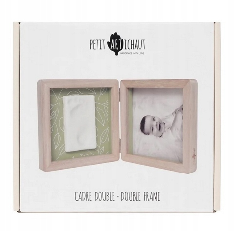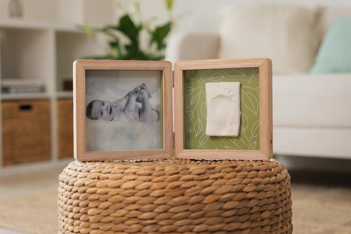 Podwójna ramka na odcisk i zdjęcie to elegancka drewniana ramka z dwoma panelami, która w wyjątkowy sposób pozwala zachować najcenniejsze wspomnienia – zdjęcie dziecka z jednej strony i jego odcisk z drugiej. Idealna do stworzenia niezapomnianej pamiątki. Dzięki odwracalnej wkładce w kolorze oliwkowej zieleni, którą można wybrać z motywem liści lub w wersji gładkiej, łatwo dopasujesz ramkę do swojego gustu. Zestaw zawiera hipoalergiczną glinkę, wałek oraz instrukcje, które ułatwią stworzenie odcisku.