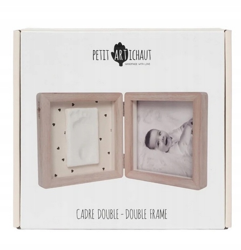 Podwójna ramka na odcisk i zdjęcie to elegancka drewniana ramka z dwoma panelami, która w wyjątkowy sposób pozwala zachować najcenniejsze wspomnienia – zdjęcie dziecka z jednej strony i jego odcisk z drugiej. Idealna do stworzenia niezapomnianej pamiątki. Dzięki odwracalnej wkładce w kolorze beżu, którą można wybrać z motywem serc lub w wersji gładkiej, łatwo dopasujesz ramkę do swojego gustu. Zestaw zawiera hipoalergiczną glinkę, wałek oraz instrukcje, które ułatwią stworzenie odcisku.