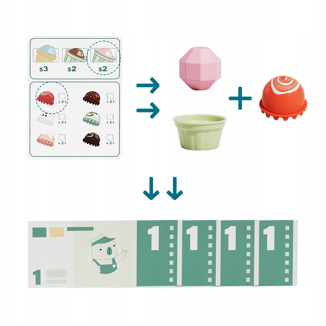 - Wybieraj i twórz lodowe kompozycje – karty zamówień z obrazkami pomagają odtworzyć konkretne kombinacje smaków i polew, a jednocześnie uczą koncentracji, logicznego myślenia i liczenia.