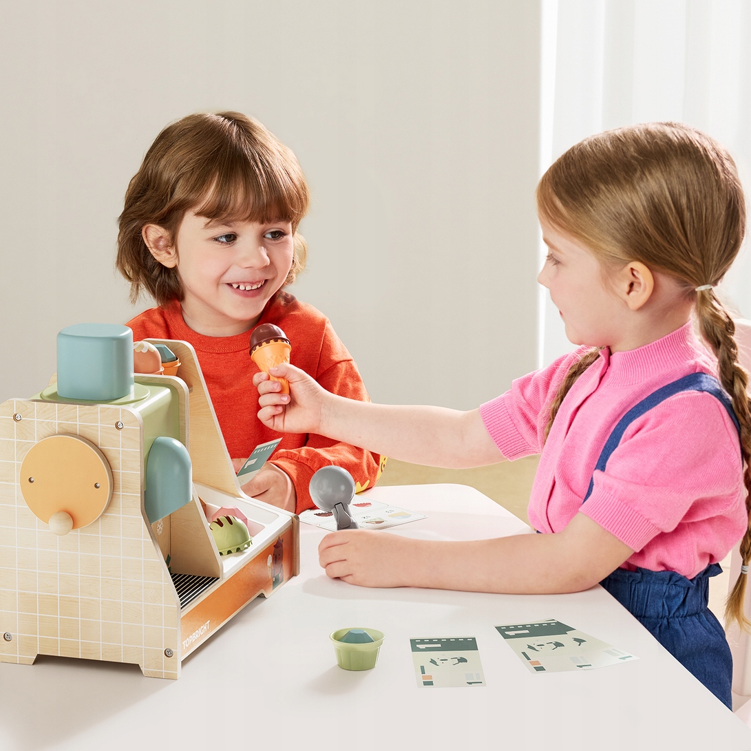 - Wspiera rozwój motoryki małej – przekręcanie korbki, nakładanie lodów, układanie dodatków i zabawa łyżką do lodów doskonale ćwiczy precyzję ruchów i sprawność dłoni.